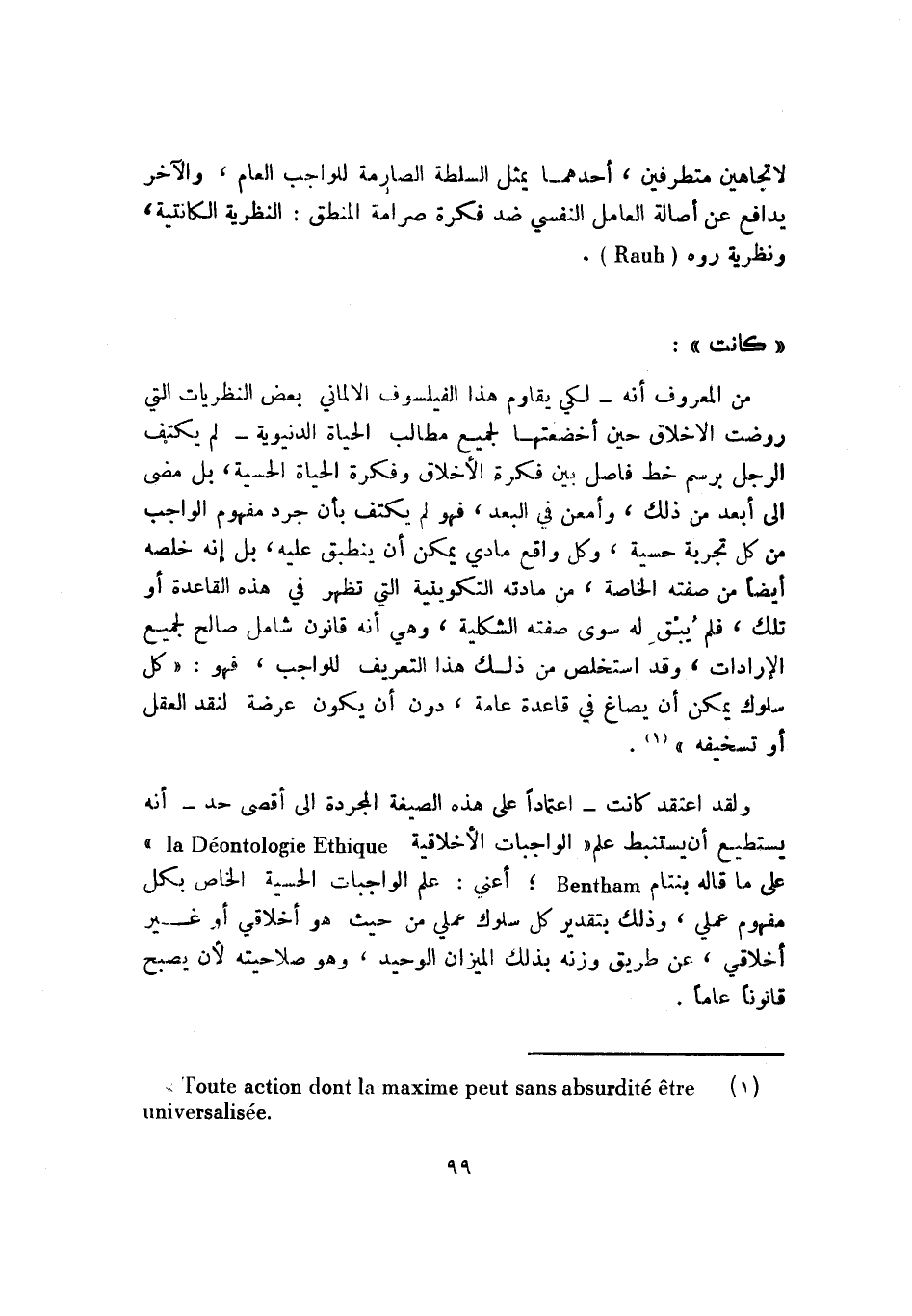 ولقد اعتقد كانت -اعتمادًا على هذه الصيغة المجردة إلى أقصى حد- أنه يستطيع أن يستنبط علم "الواجبات الأخلاقية LA DEONTOLOGIE ETHIQUE" على ما قاله بنتام BENTHAM؛ أعني: علم الواجبات الحسية الخاص بكل مفهوم عملي، وذلك بتقدير كل سلوك عملي من حيث هو أخلاقي أو غير أخلاقي، عن طريق وزنه بذلك الميزان الوحيد، وهو صلاحيته لأن يصبح قانونًا عامًّا.