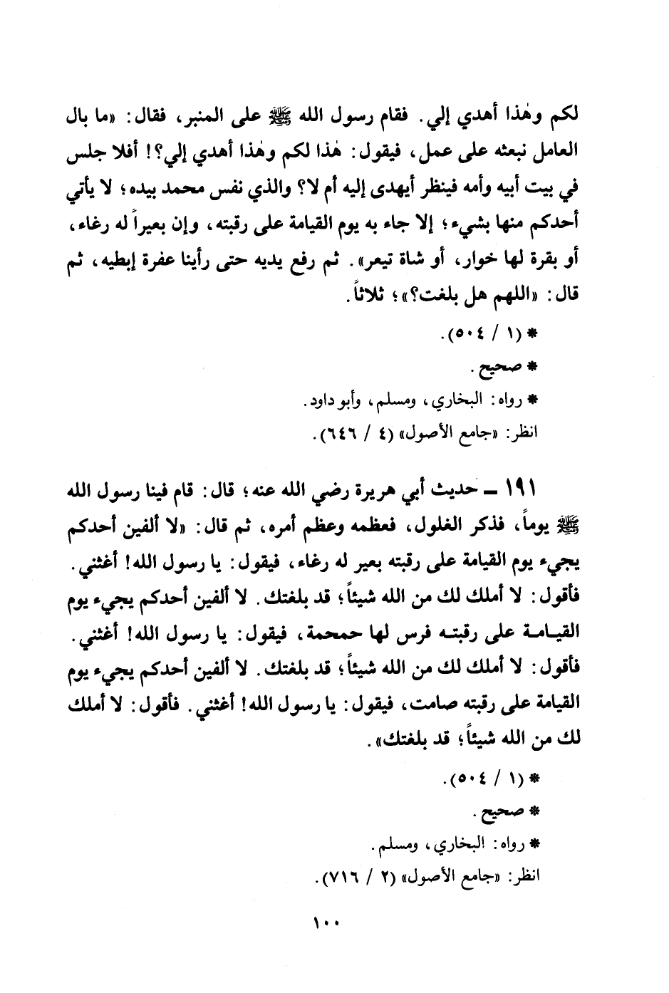 191 - حديث أبي هريرة رضي الله عنه؛ قال: قام فينا رسول الله صلى الله عليه وسلم يوماً، فذكر الغلول، فعظمه وعظم أمره، ثم قال: ((لا ألفين أحدكم يجيء يوم القيامة على رقبته بعير له رغاء، فيقول: يا رسول الله! أغثني. فأقول: لا أملك لك من الله شيئاً؛ قد بلغتك. لا ألفين أحدكم يجيء يوم القيامة على رقبته فرس لها حمحمة، فيقول: يا رسول الله! أغثني. فأقول: لا أملك لك من الله شيئاً؛ قد بلغتك. لا ألفين أحدكم يجيء يوم القيامة على رقبته صامت، فيقول: يا رسول الله! أغثني. فأقول: لا أملك لك من الله شيئاً؛ قد بلغتك)) .