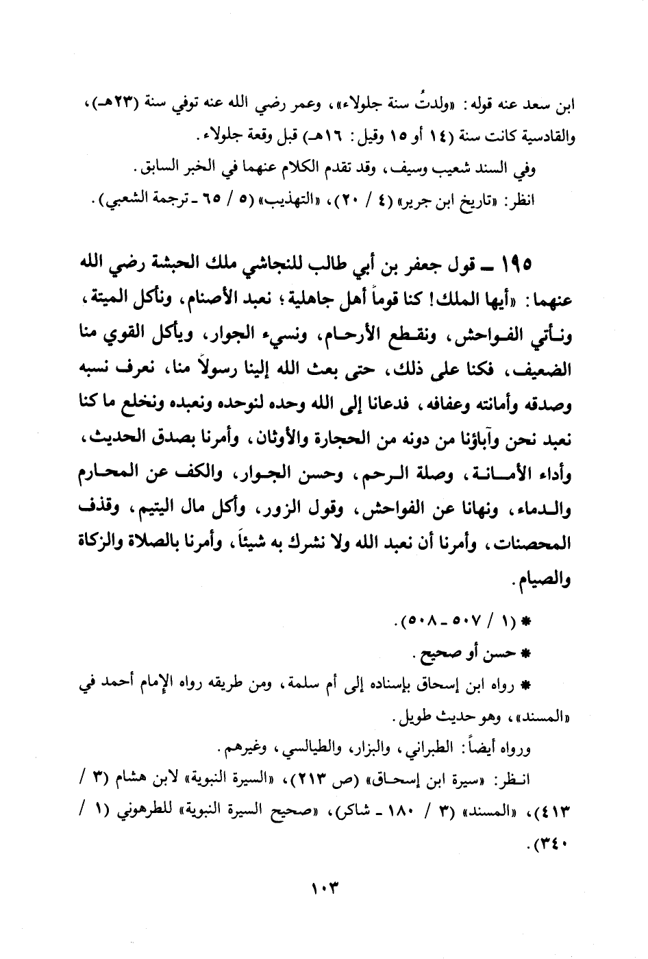 195 - قول جعفر بن أبي طالب للنجاشي ملك الحبشة رضي الله عنهما: ((أيها الملك! كنا قوماً أهل جاهلية؛ نعبد الأصنام، ونأكل الميتة، ونأتي الفواحش، ونقطع الأرحام، ونسيء الجوار، ويأكل القوي منا الضعيف، فكنا على ذلك، حتى بعث الله إلينا رسولاً منا، نعرف نسبه وصدقه وأمانته وعفافه، فدعانا إلى الله وحده لنوحده ونعبده ونخلع ما كنا نعبد نحن وآباؤنا من دونه من الحجارة والأوثان، وأمرنا بصدق الحديث، وأداء الأمانة، وصلة الرحم، وحسن الجوار، والكف عن المحارم والدماء، ونهانا عن الفواحش، وقول الزور، وأكل مال اليتيم، وقذف المحصنات، وأمرنا أن نعبد الله ولا نشرك به شيئاً، وأمرنا بالصلاة والزكاة والصيام)) .