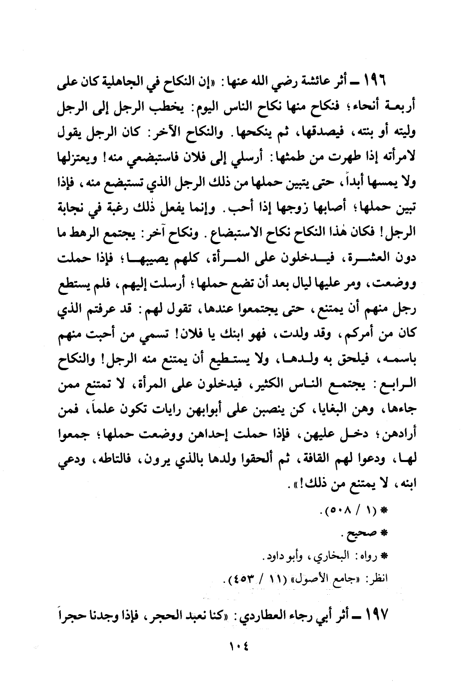 196 - أثر عائشة رضي الله عنها: ((إن النكاح في الجاهلية كان على أربعة أنحاء؛ فنكاح منها نكاح الناس اليوم: يخطب الرجل إلى الرجل وليته أو بنته، فيصدقها، ثم ينكحها. والنكاح الآخر: كان الرجل يقول لامرأته إذا طهرت من طمثها: أرسلي إلى فلان فاستبضعي منه! ويعتزلها ولا يمسها أبداً، حتى يتبين حملها من ذلك الرجل الذي تستبضع منه، فإذا تبين حملها؛ أصابها زوجها إذا أحب. وإنما يفعل ذلك رغبة في نجابة الرجل! فكان هذا النكاح نكاح الاستبضاع. ونكاح آخر: يجتمع الرهط ما دون العشرة، فيدخلون على المرأة، كلهم يصيبها؛ فإذا حملت ووضعت ومر عليها ليالٍ بعد أن تضع حملها؛ أرسلت إليهم، فلم يستطع رجل منهم أن يمتنع، حتى يجتمعوا عندها، تقول لهم: قد عرفتم الذي كان من أمركم، وقد ولدت، فهو ابنك يا فلان! تسمي من أحبت منهم باسمه، فيلحق به ولدها، ولا يستطيع أن يمتنع منه الرجل! والنكاح الرابع: يجتمع الناس الكثير، فيدخلون على المرأة، لا تمتنع ممن جاءها، وهن البغايا، كن ينصبن على أبوابهن رايات تكون علماً، فمن أرادهن؛ دخل عليهن، فإذا حملت إحداهن ووضعت حملها؛ جمعوا لها، ودعوا لهم القافة، ثم ألحقوا ولدها بالذي يرون، فالتاطه، ودعي ابنه، لا يمتنع من ذلك!)) .