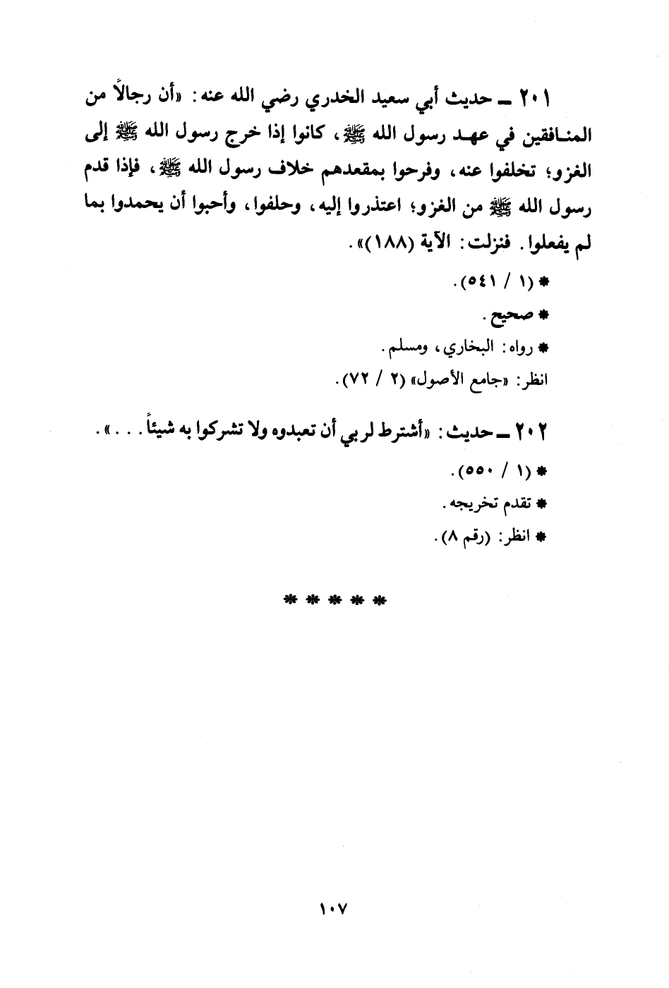 201 - حديث أبي سعيد الخدري رضي الله عنه: ((أن رجالاً من المنافقين في عهد رسول الله صلى الله عليه وسلم، كانوا إذا خرج رسول الله صلى الله عليه وسلم إلى الغزو؛ تخلفوا عنه، وفرحوا بمقعدهم خلاف رسول الله صلى الله عليه وسلم، فإذا قدم رسول الله صلى الله عليه وسلم من الغزو؛ اعتذروا إليه، وحلفوا، وأحبوا أن يحمدوا بما لم يفعلوا. فنزلت: الآية (188)) ) .