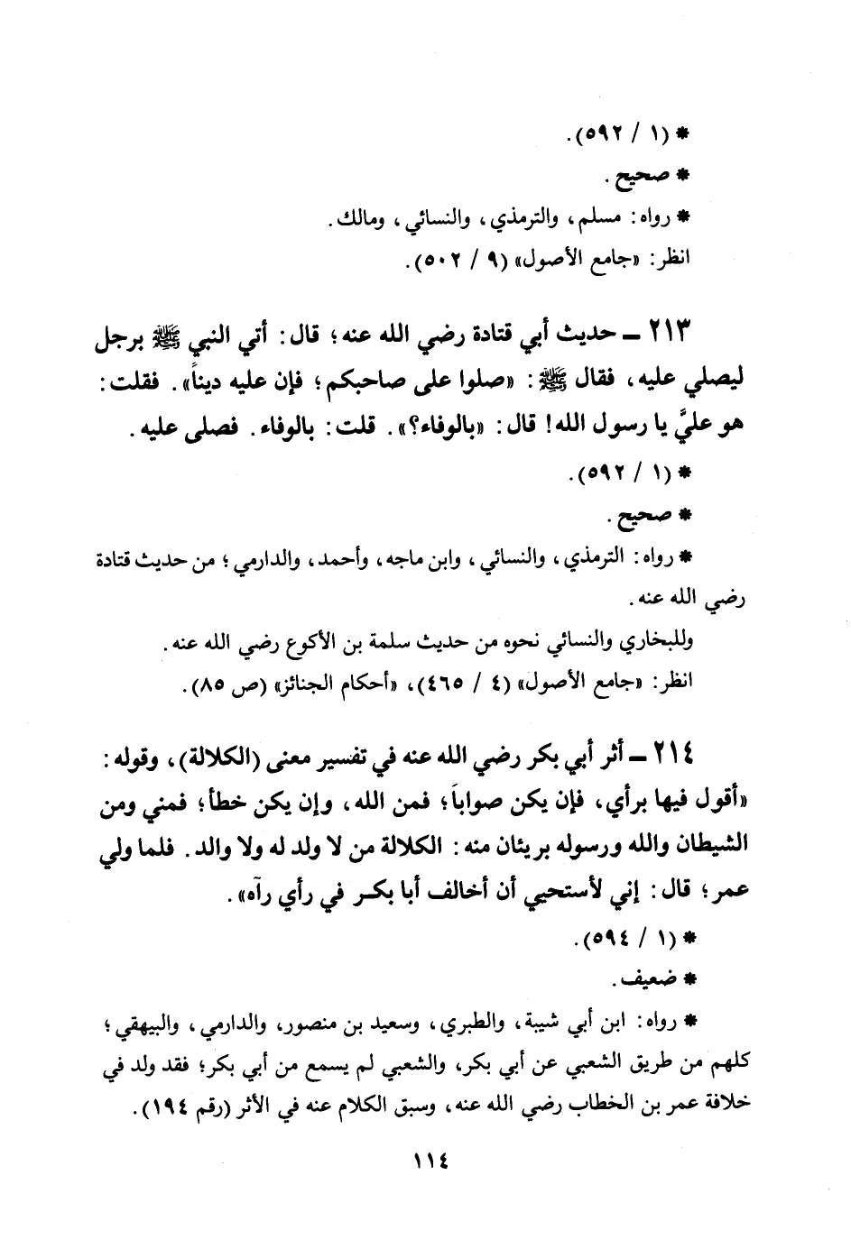 214 - أثر أبي بكر رضي الله عنه في تفسير معنى (الكلالة) ، وقوله: ((أقول فيها برأي، فإن يكن صواباً؛ فمن الله، وإن يكن خطأ؛ فمني ومن الشيطان والله ورسوله بريئان منه: الكلالة من لا ولد له ولا والد. فلما ولي عمر؛ قال: إني لأستحيي أن أخالف أبا بكر في رأي رآه)) .