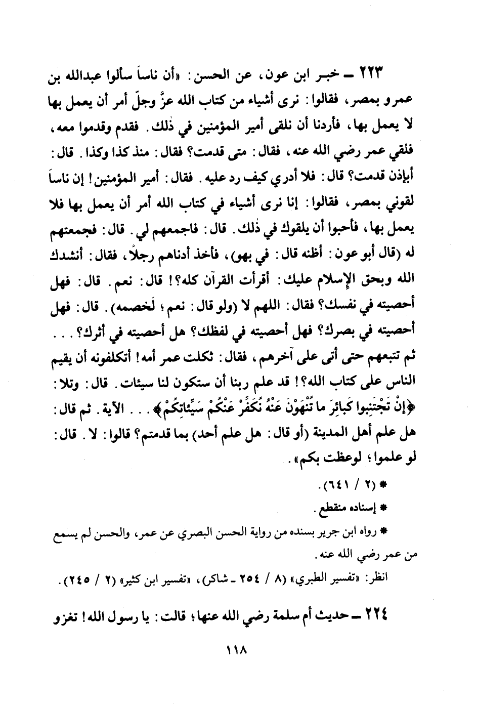 223 - خبر ابن عون، عن الحسن: ((أن ناساً سألوا عبد الله بن عمرو بمصر، فقالوا: نرى أشياء من كتاب الله عزَّ وجلَّ أمر أن يعمل بها لا يعمل بها، فأردنا أن نلقى أمير المؤمنين في ذلك. فقدم وقدموا معه، فلقي عمر رضي الله عنه، فقال: متى قدمت؟ فقال: منذ كذا وكذا. قال: أبإذن قدمت؟ قال: فلا أدري كيف رد عليه. فقال: أمير المؤمنين! إن ناساً لقوني بمصر، فقالوا: إنا نرى أشياء في كتاب الله أمر أن يعمل بها فلا يعمل بها، فأحبوا أن يلقوك في ذلك. قال: فاجمعهم لي. قال: فجمعتهم له (قال أبو عون: أظنه قال: في بهو) ، فأخذ أدناهم رجلاً، فقال: أنشدك الله وبحق الإسلام عليك: أقرأت القرآن كله؟! قال: نعم. قال: فهل أحصيته في نفسك؟ فقال: اللهم لا (ولو قال: نعم؛ لخصمه) . قال: فهل أحصيته في بصرك؟ فهل أحصيته في لفظك؟ هل أحصيته في أثرك؟ ... ثم تتبعهم حتى أتى على آخرهم، فقال: ثكلت عمر أمه! أتكلفونه أن يقيم الناس على كتاب الله؟! قد علم ربنا أن ستكون لنا سيئات. قال: وتلا: {إِن تَجْتَنِبُوا كَبَائِرَ مَا تُنْهَوْنَ عَنْهُ نُكَفِّرْ عَنكُمْ سَيِّئَاتِكُمْ ... } الآية، ثم قال: هل علم أهل المدينة (أو قال: هل علم أحد) بما قدمتم؟ قالوا: لا. قال: لو علموا؛ لوعظت بكم)) .