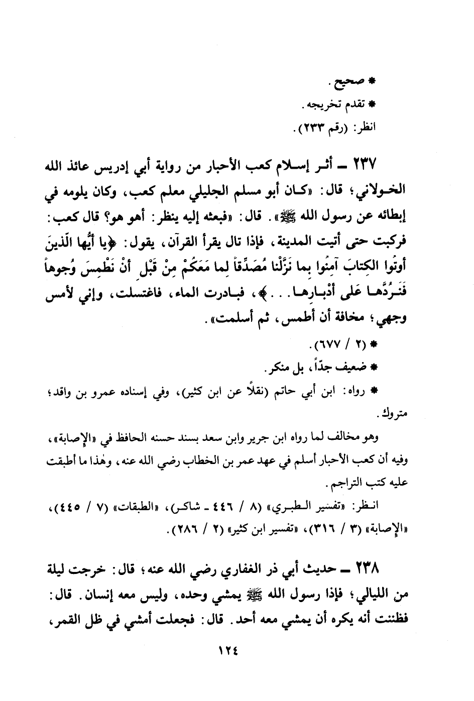 237 - أثر إسلام كعب الأحبار من رواية أبي إدريس عائذ الله الخولاني؛ قال: ((كان أبو مسلم الجليلي معلم كعب، وكان يلومه في إبطائه عن رسول الله صلى الله عليه وسلم)) . قال: ((فبعثه إليه ينظر: أهو هو؟ قال كعب: فركبت حتى أتيت المدينة، فإذا تالٍ يقرأ القرآن، يقول: {يَا أَيُّهَا الَّذِينَ أُوتُوا الْكِتَابَ آمِنُوا بِمَا نَزَّلْنَا مُصَدِّقاً لِّمَا مَعَكُم مِّن قَبْلِ أَن نَّطْمِسَ وُجُوهَا فَنَرُدَّهَا عَلَى أَدْبَارِهَا ... } ، فبادرت الماء، فاغتسلت، وإني لأمسُّ وجهي؛ مخافة أن أطمس، ثم أسلمت)) .