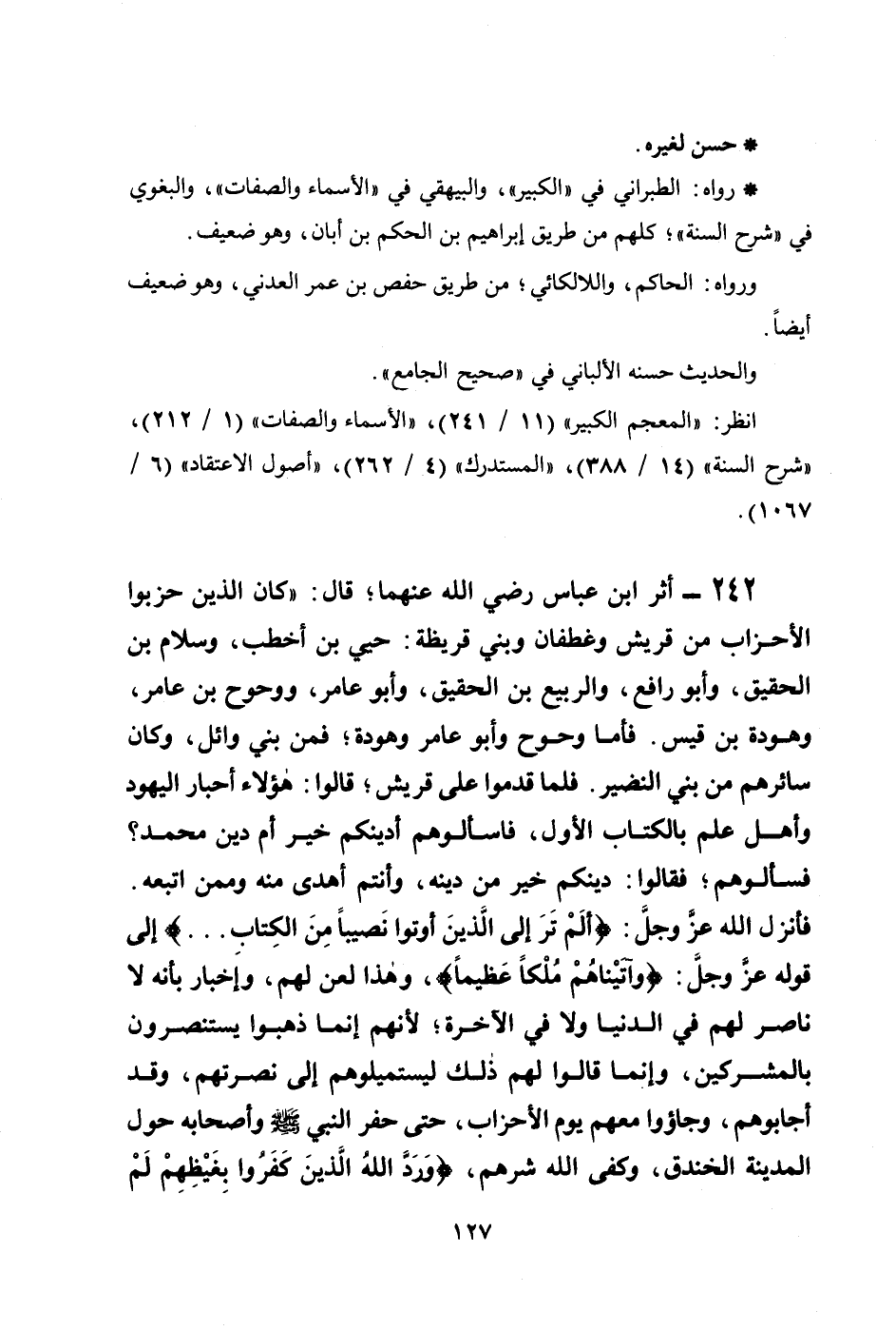 242 - أثر ابن عباس رضي الله عنهما؛ قال: ((كان الذين حزبوا الأحزاب من قريش وغطفان وبني قريظة: حيي بن أخطب، وسلام بن الحقيق، وأبو رافع، والربيع بن الحقيق، وأبو عامر، ووحوح ابن عامر، وهودة بن قيس. فأما وحوح وأبو عامر وهودة؛ فمن بني وائل، وكان سائرهم من بني النضير. فلما قدموا على قريش؛ قالوا: هؤلاء أحبار اليهود وأهل علم بالكتاب الأول، فاسألوهم أدينكم خير أم دين محمد؟ فسألوهم؛ فقالوا: دينكم خير من دينه، وأنتم أهدى منه وممن اتبعه. فأنزل الله عزَّ وجلَّ: {أَلَمْ تَرَ إِلَى الَّذِينَ أُوتُوا نَصِيباً مِّنَ الْكِتَابِ ... } إلى قوله عزَّ وجلَّ: {وَآتَيْنَاهُم مُّلْكاً عَظِيماً} ، وهذا لعن لهم، وإخبار بأنه لا ناصر لهم في الدنيا ولا في الآخرة؛ لأنهم إنما ذهبوا يستنصرون بالمشركين، وإنما قالوا لهم ذلك ليستميلوهم إلى نصرتهم، وقد أجابوهم، وجاؤوا معهم يوم الأحزاب، حتى حفر النبي صلى الله عليه وسلم وأصحابه حول المدينة الخندق، وكفى الله شرهم {وَرَدَّ اللهُ الَّذِينَ كَفَرُوا بِغَيْظِهِمْ لَمْ