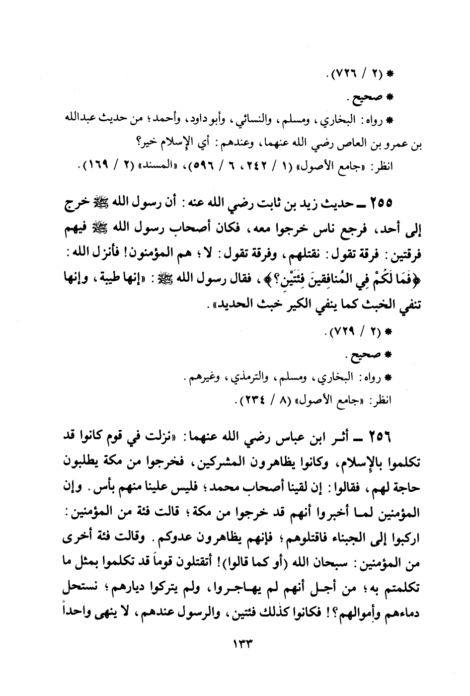 255 - حديث زيد بن ثابت رضي الله عنه: أن رسول الله صلى الله عليه وسلم خرج إلى أحد، فرجع ناس خرجوا معه، فكان أصحاب رسول الله صلى الله عليه وسلم فيهم فرقتين: فرقة تقول: نقتلهم، وفرقة تقول: لا؛ هم المؤمنون! فأنزل الله: {فَمَا لَكُمْ فِي الْمُنَافِقِينَ فِئَتَيْنِ} ، فقال رسول الله صلى الله عليه وسلم: ((إنها طيبة، وإنها تنفي الخبث كما ينفي الكير خبث الحديد)) .