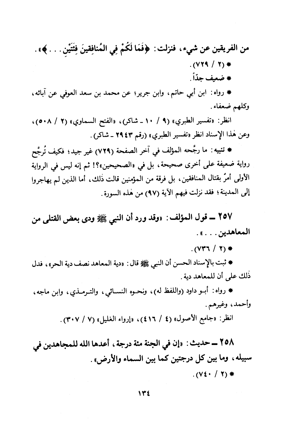 - تنبيه: ما رجَّحه المؤلف في آخر الصفحة (729) غير جيد؛ فكيف تُرجَّح رواية ضعيفة على أخرى صحيحة، بل في ((الصحيحين)) ؟! ثم إنه ليس في الرواية الأولى أمرٌ بقتال المنافقين، بل فرقة من المؤمنين قالت ذلك، أما الذين لم يهاجروا إلى المدينة؛ فقد نزلت في الآية (97) من هذه السورة.