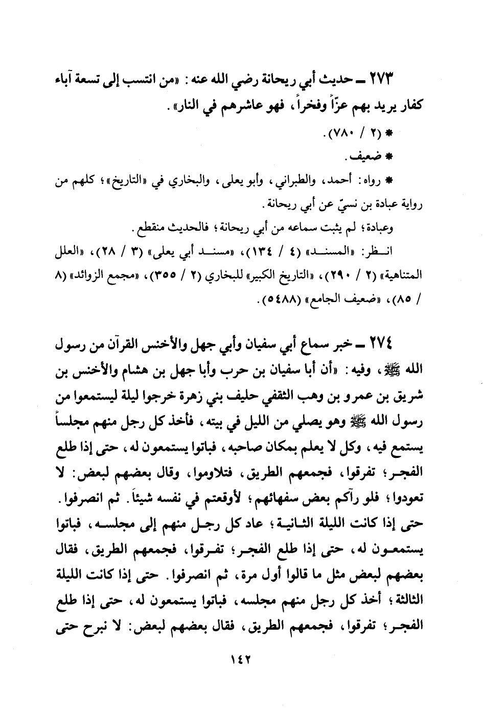 274 - خبر سماع أبي سفيان وأبي جهل والأخنس القرآن من رسول الله صلى الله عليه وسلم، وفيه: ((أن أبا سفيان بن حرب وأبا جهل بن هشام والأخنس بن شريق بن عمرو بن وهب الثقفي حليف بني زهرة خرجوا ليلة ليستمعوا من رسول الله صلى الله عليه وسلم وهو يصلي من الليل في بيته، فأخذ كل رجل منهم مجلساً يستمع فيه، وكل لا يعلم بمكان صاحبه، فباتوا يستمعون له، حتى إذا طلع الفجر؛ تفرقوا، فجمعهم الطريق، فتلاوموا، وقال بعضهم لبعض: لا تعودوا؛ فلو رآكم بعض سفهائهم؛ لأوقعتم في نفسه شيئاً. ثم انصرفوا. حتى إذا كانت الليلة الثانية؛ عاد كل رجل منهم إلى مجلسه، فباتوا يستمعون له، حتى إذا طلع الفجر؛ تفرقوا، فجمعهم الطريق، فقال بعضهم لبعض مثل ما قالوا أول مرة، ثم انصرفوا. حتى إذا كانت الليلة الثالثة أخذ كل رجل منهم مجلسه فباتوا يستمعون له حتى إذا طلع الفجر تفرقوا فجمعهم الطريق فقال بعضهم لبعض: لا نبرح حتى
