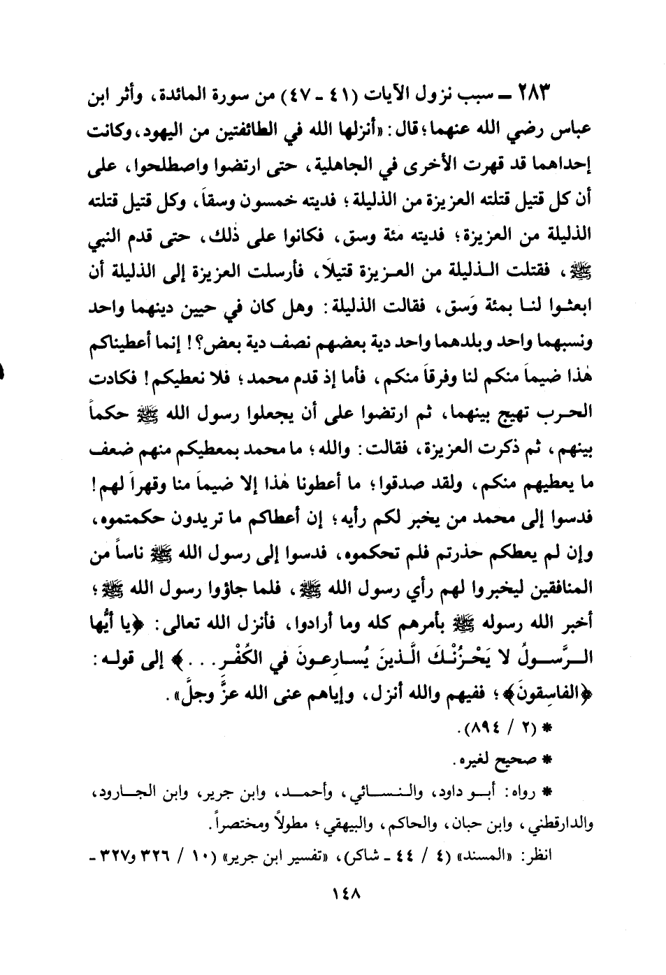 283 - سبب نزول الآيات (41-47) من سورة المائدة، وأثر ابن عباس رضي الله عنهما؛ قال: ((أنزلها الله في الطائفتين من اليهود، وكانت إحداهما قد قهرت الأخرى في الجاهلية، حتى ارتضوا واصطلحوا، على أن كل قتيل قتلته العزيزة من الذليلة؛ فديته خمسون وسقاً، وكل قتيل قتلته الذليلة من العزيزة؛ فديته مئة وسق، فكانوا على ذلك، حتى قدم النبي صلى الله عليه وسلم، قتلت الذليلة من العزيزة قتيلاً، فأرسلت العزيزة إلى الذليلة أن ابعثوا لنا بمئة وَسق، فقالت الذليلة: وهل كان في حيين دينهما واحد ونسبهما واحد وبلدهما واحد دية بعضهم نصف دية بعض؟ إنما أعطيناكم هذا ضيماً منكم لنا وفرقاً منكم، فأما إذ قدم محمد؛ فلا نعطيكم! فكادت الحرب تهيج بينهما، ثم ارتضوا أن يجعلوا رسول الله صلى الله عليه وسلم حكماً بينهم، ثم ذكرت العزيزة، فقالت: والله؛ ما محمد بمعطيكم منهم ضعف ما يعطيهم منكم، ولقد صدقوا؛ ما أعطونا هذا إلا ضيماً منا وقهراً لهم! فدسوا إلى محمد من يخبر لكم رأيه؛ إن أعطاكم ما تريدون حكمتموه، وإن لم يعطكم حذرتم فلم تحكموه، فدسوا إلى رسول الله صلى الله عليه وسلم ناساً من المنافقين ليخبروا لهم رأي رسول الله صلى الله عليه وسلم، فلما جاؤوا رسول الله صلى الله عليه وسلم؛ أخبر الله رسوله صلى الله عليه وسلم بأمرهم كله وما أرادوا، فأنزل الله تعالى: {يَا أَيُّهَا الرَّسُولُ لاَ يَحْزُنكَ الَّذِينَ يُسَارِعُونَ فِي الْكُفْرِ ... } إلى قوله: {الْفَاسِقُونَ} ؛ ففيهم والله أنزل، وإياهم عنى الله عزَّ وجلَّ)) .