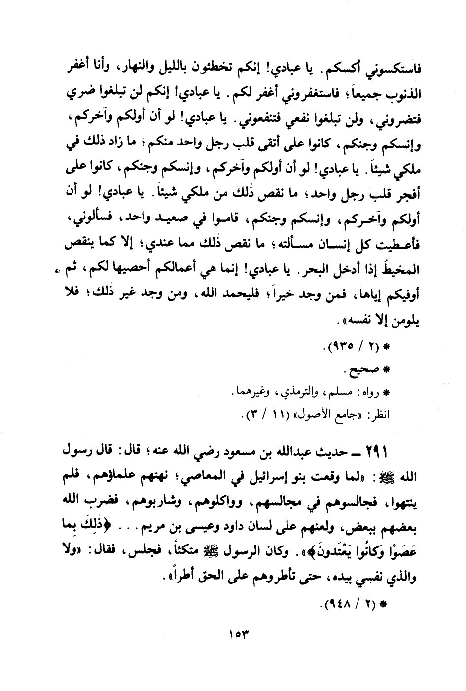 291 - حديث عبد الله بن مسعود رضي الله عنه؛ قال: قال رسول الله صلى الله عليه وسلم: ((لما وقعت بنو إسرائيل في المعاصي؛ نهتهم علماؤهم، فلم ينتهوا، فجالسوهم في مجالسهم، وواكلوهم، وشاربوهم، فضرب الله بعضهم ببعض، ولعنهم على لسان داود وعيسى بن مريم.. {ذَلِكَ بِمَا عَصَوا وَّكَانُوا يَعْتَدُونَ} )) . وكان الرسول صلى الله عليه وسلم متكئاً، فجلس، فقال: ((ولا والذي نفسي بيده، حتى تأطروهم على الحق أطراً)) .