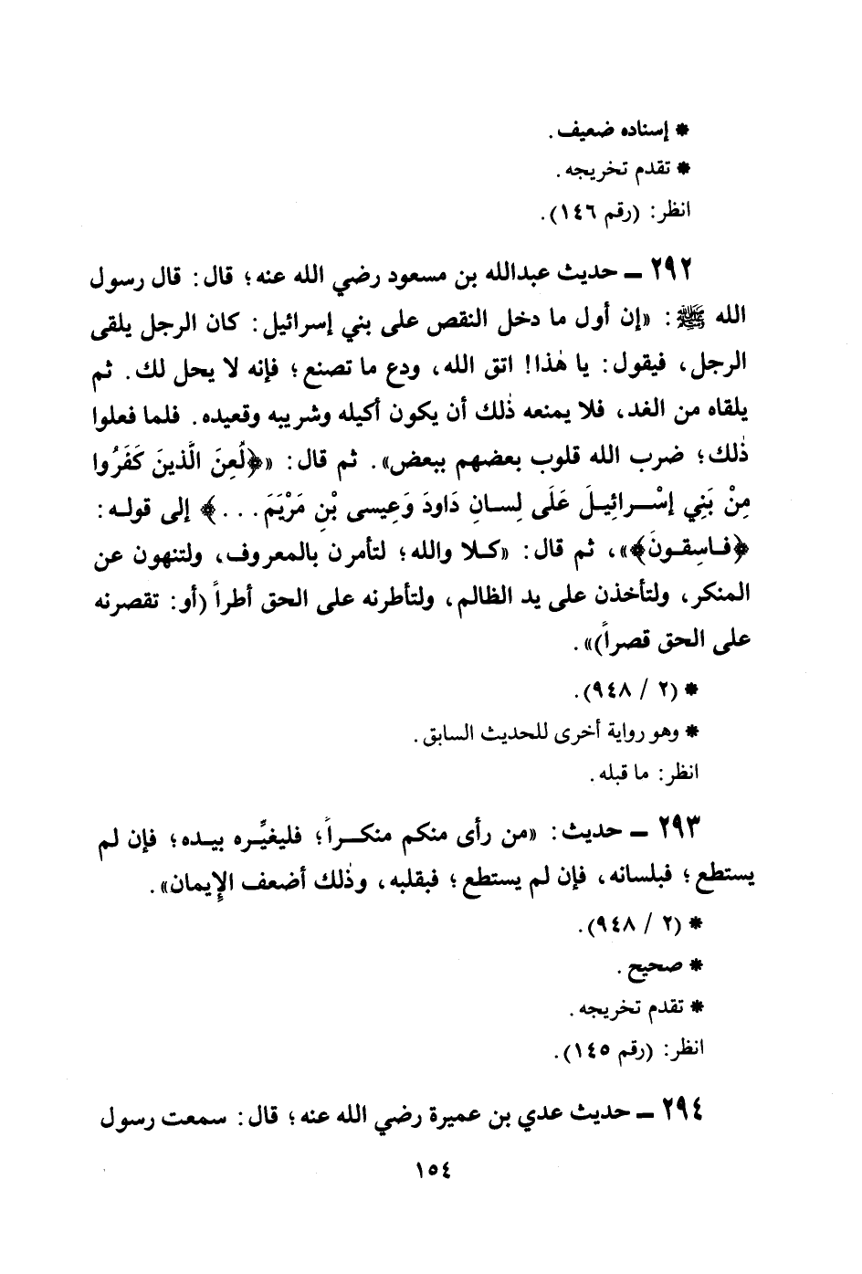 292 - حديث عبد الله بن مسعود رضي الله عنه؛ قال: قال رسول الله صلى الله عليه وسلم: ((إن أول ما دخل النقص على بني إسرائيل: كان الرجل يلقى الرجل فيقول: يا هذا! اتَّقِ الله، ودع ما تصنع؛ فإنه لا يحل لك. ثم يلقاه من الغد، فلا يمنعه ذلك أن يكون أكيله وشريبه وقعيده. فلما فعلوا ذلك؛ ضرب اله قلوب بعضهم ببعض)) . ثم قال: (( {لُعِنَ الَّذِينَ كَفَرُوا مِن بَنِي إِسْرَائِيلَ عَلَى لِسَانِ دَاوُدَ وَعِيسَى ابْنِ مَرْيَمَ ... } إلى قوله: {فَاسِقُونَ} )) ، ثم قال: ((كلا والله؛ لتأمرن بالمعروف، ولتنهون عن المنكر، ولتأخذن على يد الظالم، ولتأطرنه على الحق أطراً (أو: تقصرنه على الحق قصراً)) ) .