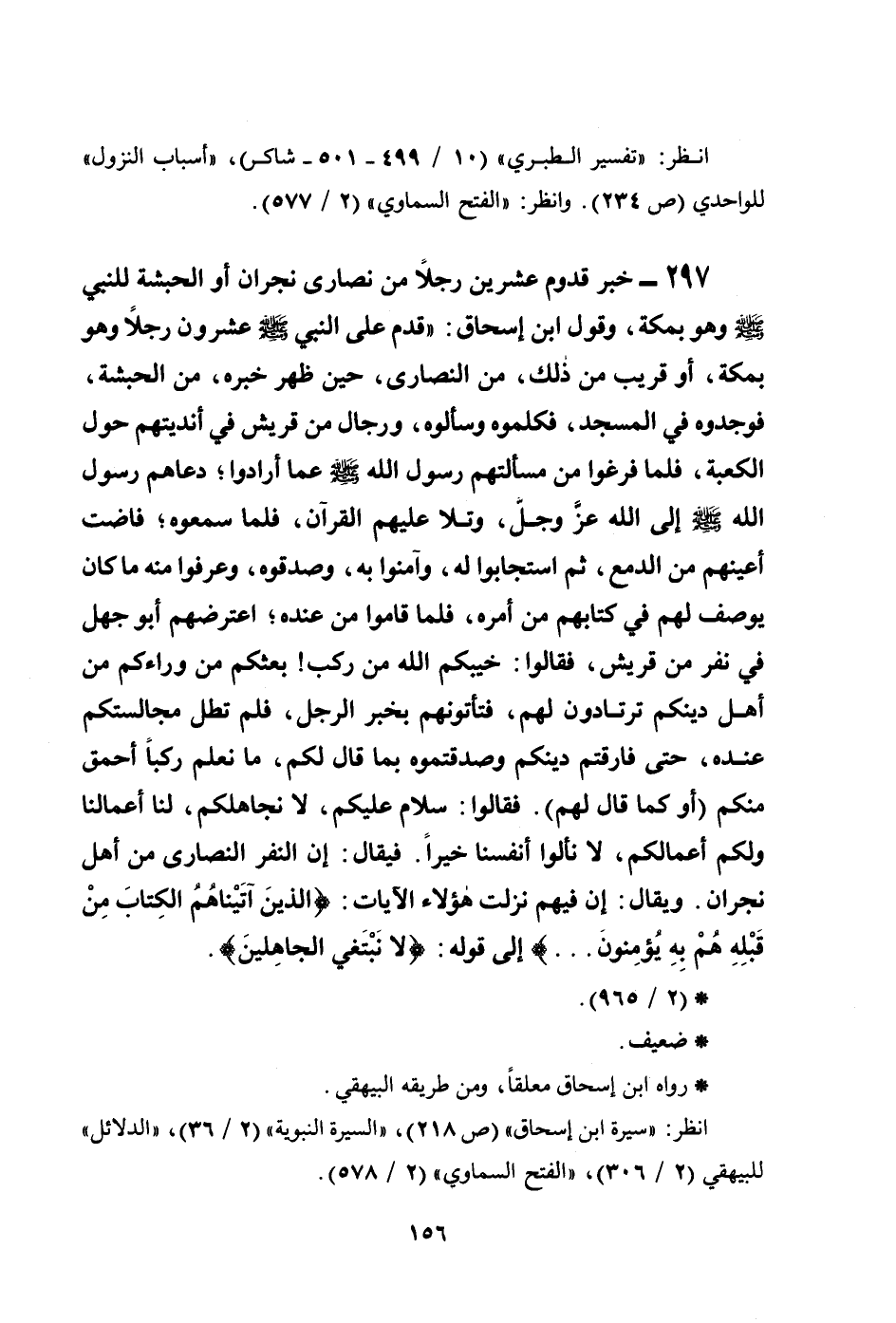 297 - خبر قدوم عشرين رجلاً من نصارى نجران أو الحبشة للنبي صلى الله عليه وسلم وهو بمكة، وقول ابن إسحاق: ((قدم على النبي صلى الله عليه وسلم عشرون رجلاً وهو بمكة، أو قريب من ذلك، من النصارى، حين ظهر خبره، من الحبشة، فوجدوه في المسجد، فكلموه وسألوه، ورجال من قريش في أنديتهم حول الكعبة، فلما فرغوا من مسألتهم رسول الله صلى الله عليه وسلم عما أرادوا؛ دعاهم رسول الله صلى الله عليه وسلم إلى الله عزَّ وجلَّ، وتلا عليهم القرآن، فلما سمعوه؛ فاضت أعينهم من الدمع، ثم استجابوا له، وآمنوا به، وصدقوه، وعرفوا منه ما كان يوصف لهم في كتابهم من أمره، فلما قاموا من عنده؛ اعترضهم أبو جهل في نفر من قريش، فقالوا: خيبكم الله من ركب بعثكم من وراءكم من أهل دينكم ترتادون لهم، فتأتونهم بخبر الرجل، فلم تطل مجالستكم عنده، حتى فارقتم دينكم وصدقتموه بما قال لكم، ما نعلم ركباً أحمق منكم (أو كما قال لهم) . فقالوا: سلام عليكم، لا نجاهلكم، لنا أعمالنا ولكم أعمالكم، لا نألوا أنفسنا خيراً. فيقال: إن النفر النصارى من أهل نجران. ويقال: إن فيهم نزلت هؤلاء الآيات: {الَّذِينَ آتَيْنَاهُمُ الْكِتَابَ مِن قَبْلِهِ هُم بِهِ يُؤْمِنُونَ ... } إلى قوله: {لا نَبْتَغِي الْجَاهِلِينَ} .
