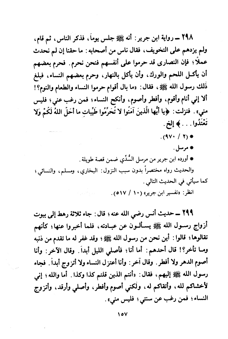 298 - رواية ابن جرير: أنه صلى الله عليه وسلم جلس يوماً، فذكر الناس، ثم قام، ولم يزدهم على التخويف، فقال ناس من أصحابه: ما حقنا إن لم نحدث عملاً؛ فإن النصارى قد حرموا على أنفسهم فنحن نحرم. فحرم بعضهم أن يأكل اللحم والورك، وأن يأكل بالنهار، وحرم بعضهم النساء، فبلغ ذلك رسول الله صلى الله عليه وسلم، فقال: ((ما بال أقوام حرموا النساء والطعام والنوم؟ ألا إني أنام وأقوم، وأفطر وأصوم، وأنكح النساء؛ فمن رغب عني؛ فليس مني)) . فنزلت: {يَا أَيُّهَا الَّذِينَ آمَنُوا لاَ تُحَرِّمُوا طَيِّبَاتِ مَا أَحَلَّ اللهُ لَكُمْ وَلاَ تَعْتَدُوا ... } إلخ.