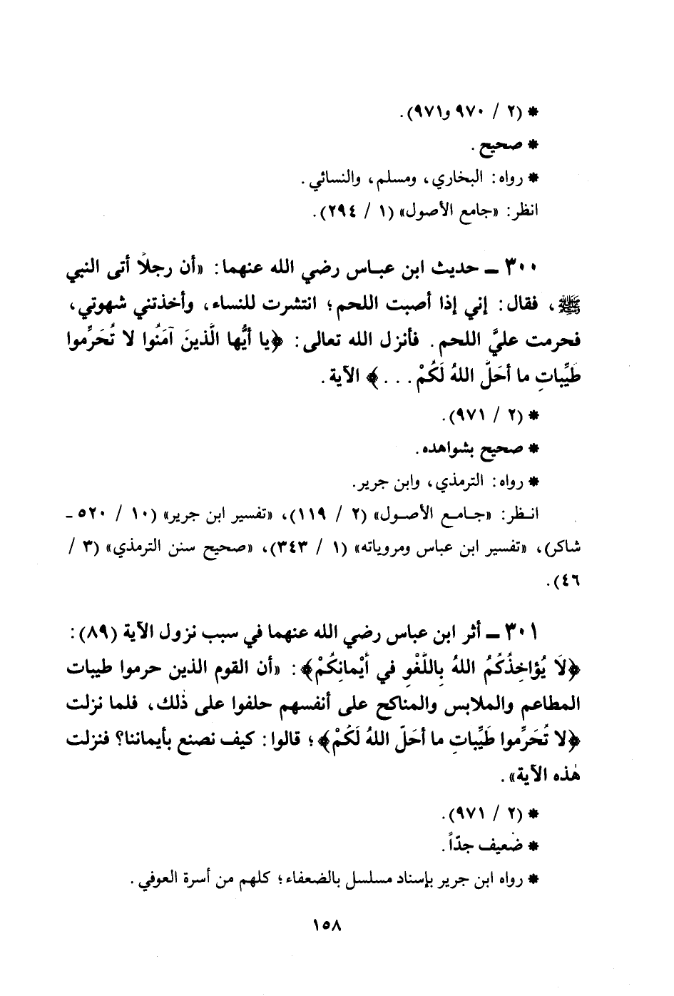 300 - حديث ابن عباس رضي الله عنهما: ((أن رجلاً أتى النبي صلى الله عليه وسلم، فقال: إني إذا أصبت اللحم؛ انتشرت للنساء، وأخذتني شهوتي، فحرمت عليَّ اللحم، فأنزل الله تعالى: {يَا أَيُّهَا الَّذِينَ آمَنُوا لا تُحَرِّمُوا طَيِّبَاتِ مَا أَحَلَّ اللهُ لَكُمْ..} الآية.
