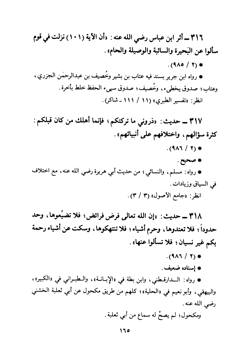 316 - أثر ابن عباس رضي الله عنه: ((أن الآية (101) نزلت في قوم سألوا عن البَحيرة والسائبة والوصيلة والحام)) .