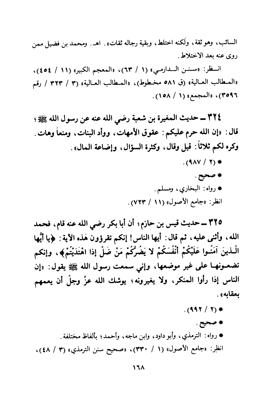 325 - حديث قيس بن حازم؛ أن أبا بكر رضي الله عنه قام، فحمد الله، وأثنى عليه، ثم قال: أيها الناس! إنكم تقرؤون هذه الآية: {يَا أَيُّهَا الَّذِينَ آمَنُوا عَلَيْكُمْ أَنفُسَكُمْ لاَ يَضُرُّكُم مَّن ضَلَّ إِذَا اهْتَدَيْتُمْ} ، وإنكم تضعونها على غير موضعها، وإني سمعت رسول الله صلى الله عليه وسلم يقول: ((إن الناس إذا رأوا المنكر، ولا يغيرونه؛ يوشك الله عزَّ وجلَّ أن يعمهم بعقابه)) .