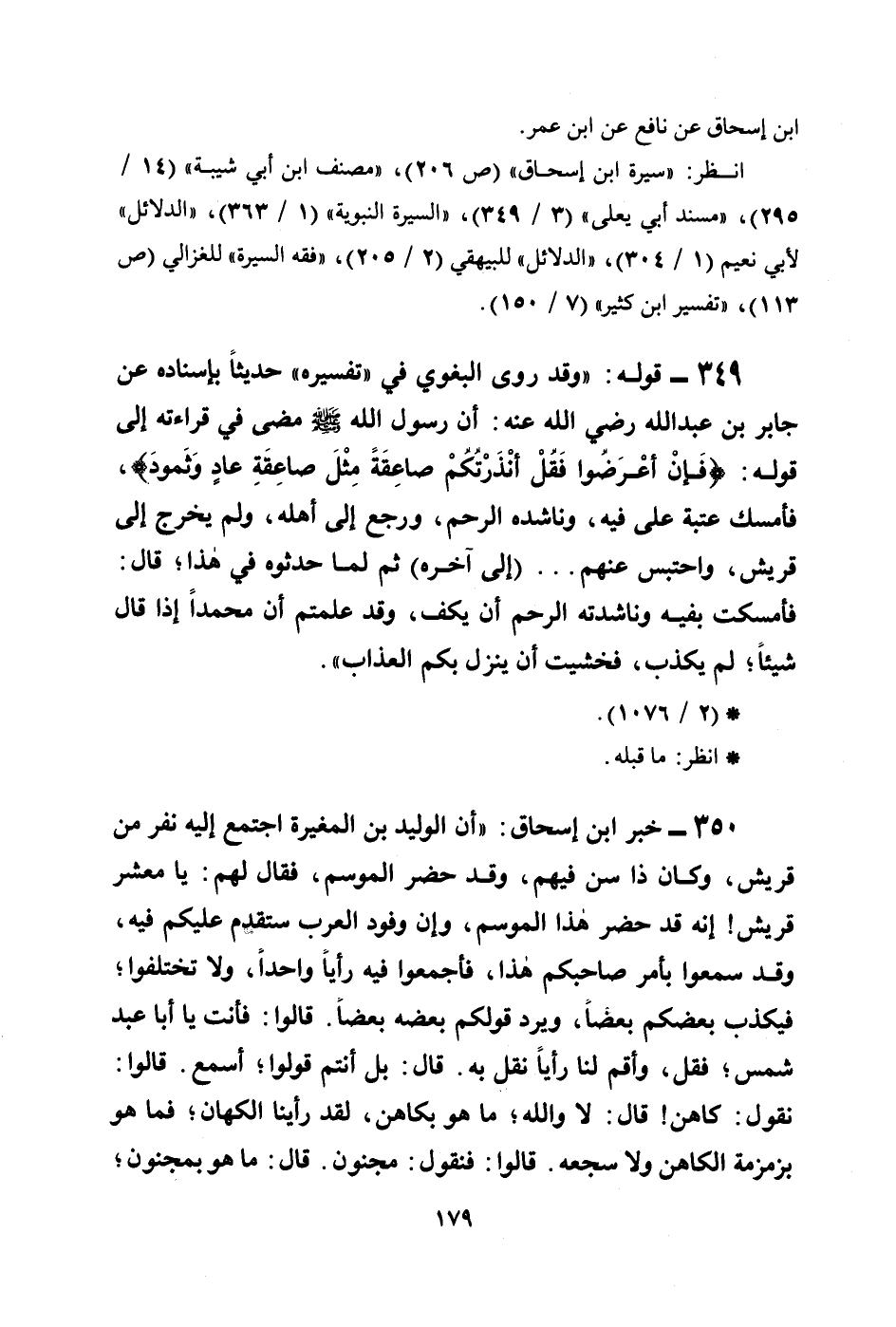 350 - خبر ابن إسحاق: ((أن الوليد بن المغيرة اجتمع إليه نفر من قريش، وكان ذا سن فيهم، وقد حضر الموسم، فقال لهم: يا معشر قريش! إنه قد حضر هذا الموسم، وإن وفود العرب ستقدم عليكم فيه، وقد سمعوا بأمر صاحبكم هذا، فأجمعوا فيه رأياً واحداً، ولا تختلفوا؛ فيكذب بعضكم بعضاً، ويرد قولكم بعضه بعضاً. قالوا: فأنت يا أبا عبد شمس؛ فقل، وأقم لنا رأياً نقل به. قال: بل أنتم قولوا؛ أسمع. قالوا: نقول: كاهن! قال: لا والله؛ ما هو بكاهن، لقد رأينا الكهَّان؛ فما هو بزمزمة الكاهن ولا سجعه. قالوا: فنقول: مجنون. قال: ما هو بمجنون؛