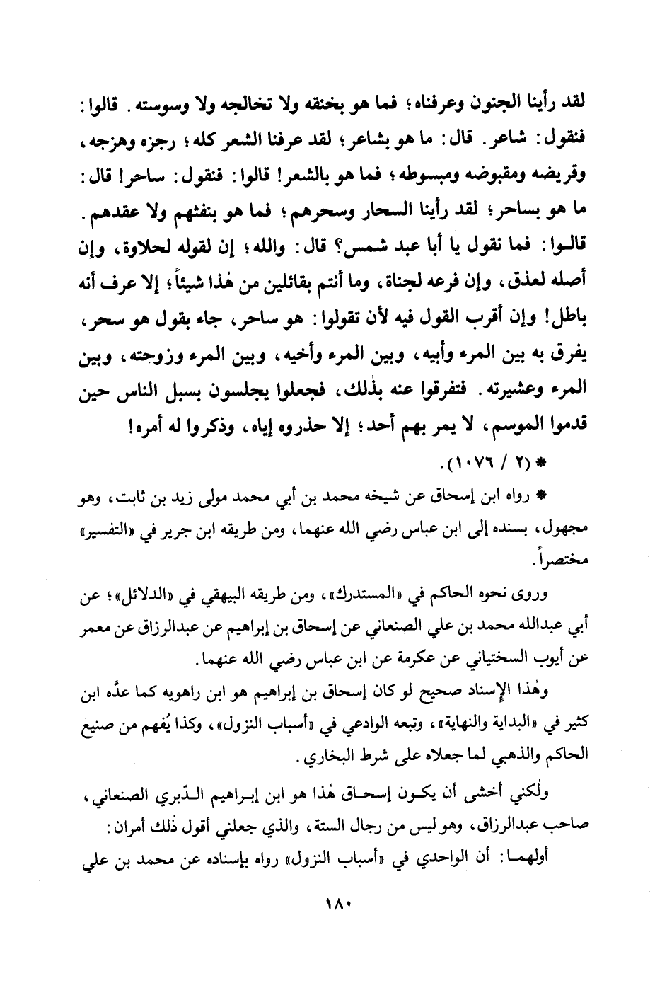 لقد رأينا الجنون وعرفناه؛ فما هو بخنقه ولا تخالجه ولا وسوسته. قالوا: فنقول: شاعر. قال: ما هو بشاعر؛ لقد عرفنا الشعر كله؛ رجزه وهزجه، وقريضه ومقبوضه ومبسوطه؛ فما هو بالشعر! قالوا: فنقول: ساحر! قال: ما هو بساحر؛ لقد رأينا السحار وسحرهم؛ فما هو بنفثهم ولا عقدهم. قالوا: فما نقول يا أبا عبد شمس؟ قال: والله؛ إن لقوله لحلاوة، وإن أصله لعذق، وإن فرعه لجناة، وما أنتم بقائلين من هذا شيئاً؛ إلا عرف أنه باطل! وإن أقرب القول فيه لأن تقولوا: هو ساحر، جاء بقول هو سحر، يفرق به بين المرء وأبيه، وبين المرء وأخيه، وبين المرء وزوجته، وبين المرء وعشيرته، فتفرقوا عنه بذلك, فجعلوا يجلسون بسبل الناس حين قدموا الموسم، لا يمر بهم أحد؛ إلا حذروه إياه، وذكروا له أمره!)) .