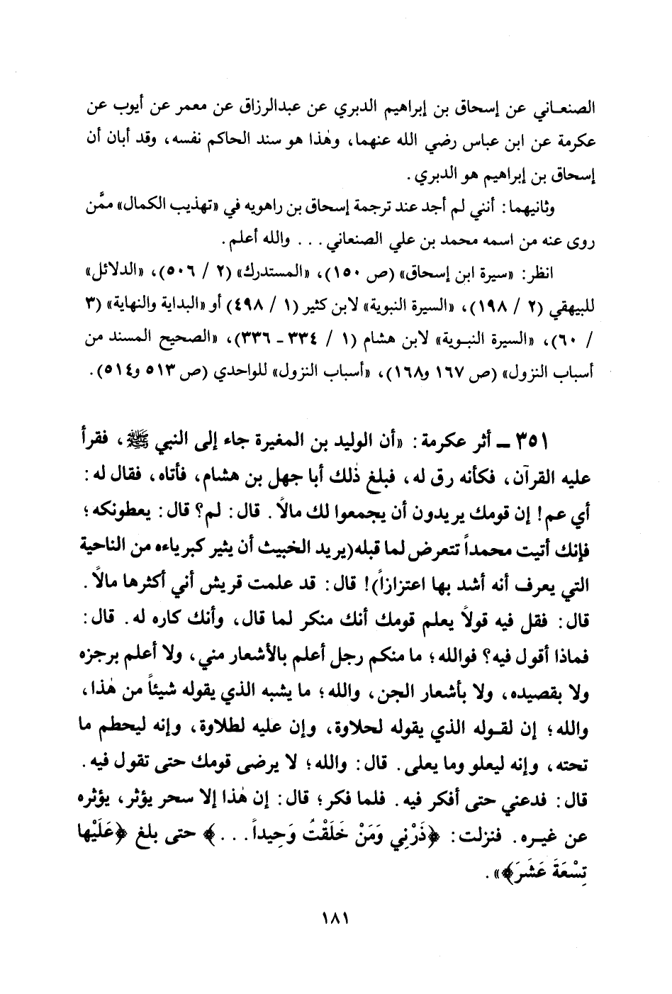 351 - أثر عكرمة: ((أن الوليد بن المغيرة جاء إلى النبي صلى الله عليه وسلم، فقرأ عليه القرآن، فكأنه رق له، فبلغ ذلك أبا جهل بن هشام، فأتاه، فقال له: أي عم! إن قومك يريدون أن يجمعوا لك مالاً. قال: لم؟ قال: يعطونكه؛ فإنك أتيت محمداً تتعرض لما قبله (يريد الخبيث أن يثير كبرياءه من الناحية التي يعرف أنه أشد بها اعتزازاً) ! قال: قد علمت قريش أني أكثرها مالاً. قال: فقل فيه قولاً يعلم قومك أنك منكر لما قال، وأنك كاره له. قال: فماذا أقول فيه؟ فوالله؛ ما منكم رجل أعلم بالأشعار مني، ولا أعلم برجزه ولا بقصيده، ولا بأشعار الجن، والله؛ ما يشبه الذي يقوله شيئاً من هذا، والله؛ إن لقوله الذي يقوله لحلاوة، وإن عليه لطلاوة، وإنه ليحطم ما تحته، وإنه ليعلو وما يعلى. قال: والله؛ لا يرضى قومك حتى تقول فيه. قال: فدعني حتى أفكر فيه. فلما فكر؛ قال: إن هذا إلا سحر يؤثر، يؤثره عن غيره. فنزلت: {ذَرْنِي وَمَنْ خَلَقْتُ وَحِيداً..} ، حتى بلغ {عَلَيْهَا تِسْعَةَ عَشَرَ} )) .