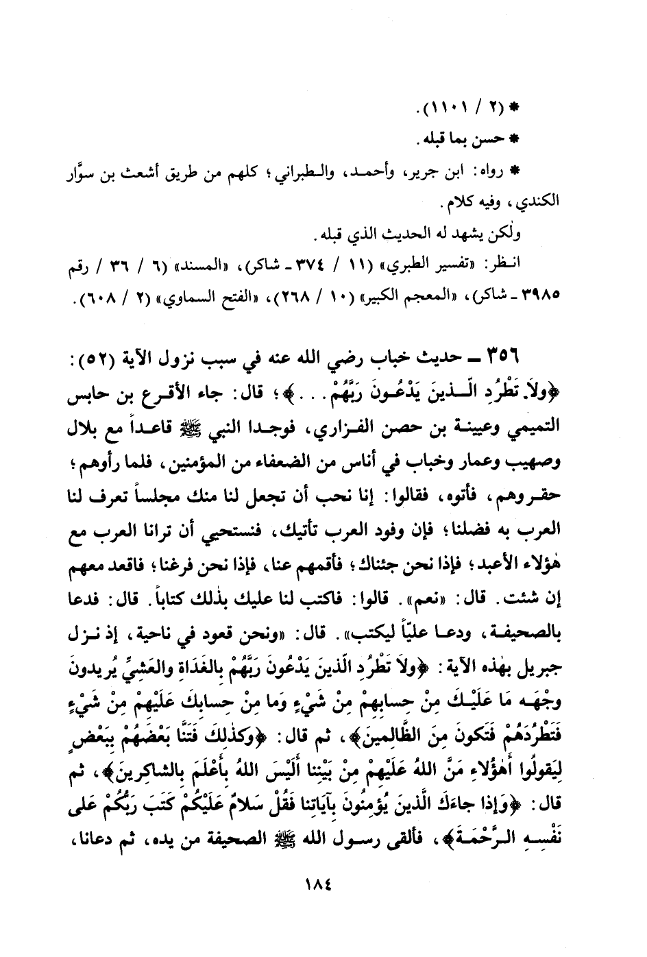 356 - حديث خباب رضي الله عنه في سبب نزول الآية (52) : {وَلاَ تَطْرُدِ الَّذِينَ يَدْعُونَ رَبَّهُم ... } ؛ قال: جاء الأقرع بن حابس التميمي وعيينة بن حصن الفزاري، فوجدا النبي صلى الله عليه وسلم قاعداً مع بلال وصهيب وعمار وخباب في أناس من الضعفاء من المؤمنين، فلما رأوهم؛ حقروهم، فأتوه، فقالوا: إنا نحب أن تجعل لنا منك مجلساً تعرف لنا العرب به فضلنا؛ فإن وفود العرب تأتيك، فنستحيي أن ترانا العرب مع هؤلاء الأعبد؛ فإذا نحن جئناك؛ فأقمهم عنا، فإذا نحن فرغنا؛ فاقعد معهم إن شئت. قال: ((نعم)) . قالوا: فاكتب لنا عليك بذلك كتاباً. قال: فدعا بالصحيفة، ودعا عليَّاً ليكتب. قال: ونحن قعود في ناحية؛ إذ نزل جبريل بهذه الآية: {وَلاَ تَطْرُدِ الَّذِينَ يَدْعُونَ رَبَّهُم بِالْغَدَاة وَالْعَشِيِّ يُرِيدُونَ وَجْهَهُ مَا عَلَيْكَ مِنْ حِسَابِهِم مِّن شَيْءٍ وَمَا مِنْ حِسَابِكَ عَلَيْهِم مِّن شَيْءٍ فَتَطْرُدَهُمْ فَتَكُونَ مِنَ الظَّالِمِينَ} ، ثم قال: {وَكَذَلِكَ فَتَنَّا بَعْضَهُم بِبَعْضٍ لَّيَقُولُوا أَهَؤُلاَءِ مَنَّ اللهُ عَلَيْهِم مِّن بَيْنِنَا أَلَيْسَ اللهُ بِأَعْلَمَ بِالشَّاكِرِينَ} ، ثم قال: {وَإِذَا جَاءَكَ الَّذِينَ يُؤْمِنُونَ بِآيَاتِنَا فَقُلْ سَلامٌ عَلَيْكُمْ كَتَبَ رَبُّكُمْ عَلَى نَفْسِهِ الرَّحْمَةَ} ، فألقى رسول الله صلى الله عليه وسلم الصحيفة من يده، ثم دعانا،