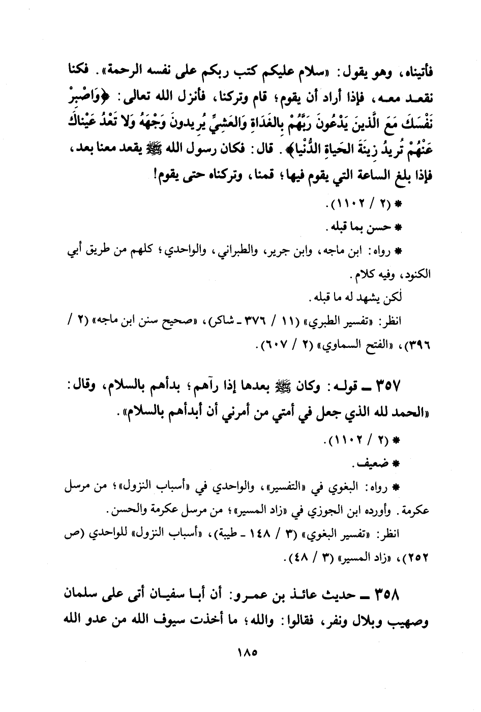357 - قوله: وكان صلى الله عليه وسلم بعدها إذا رآهم؛ بدأهم بالسلام، وقال: ((الحمد لله الذي جعل في أمتي من أمرني أن أبدأهم بالسلام)) .