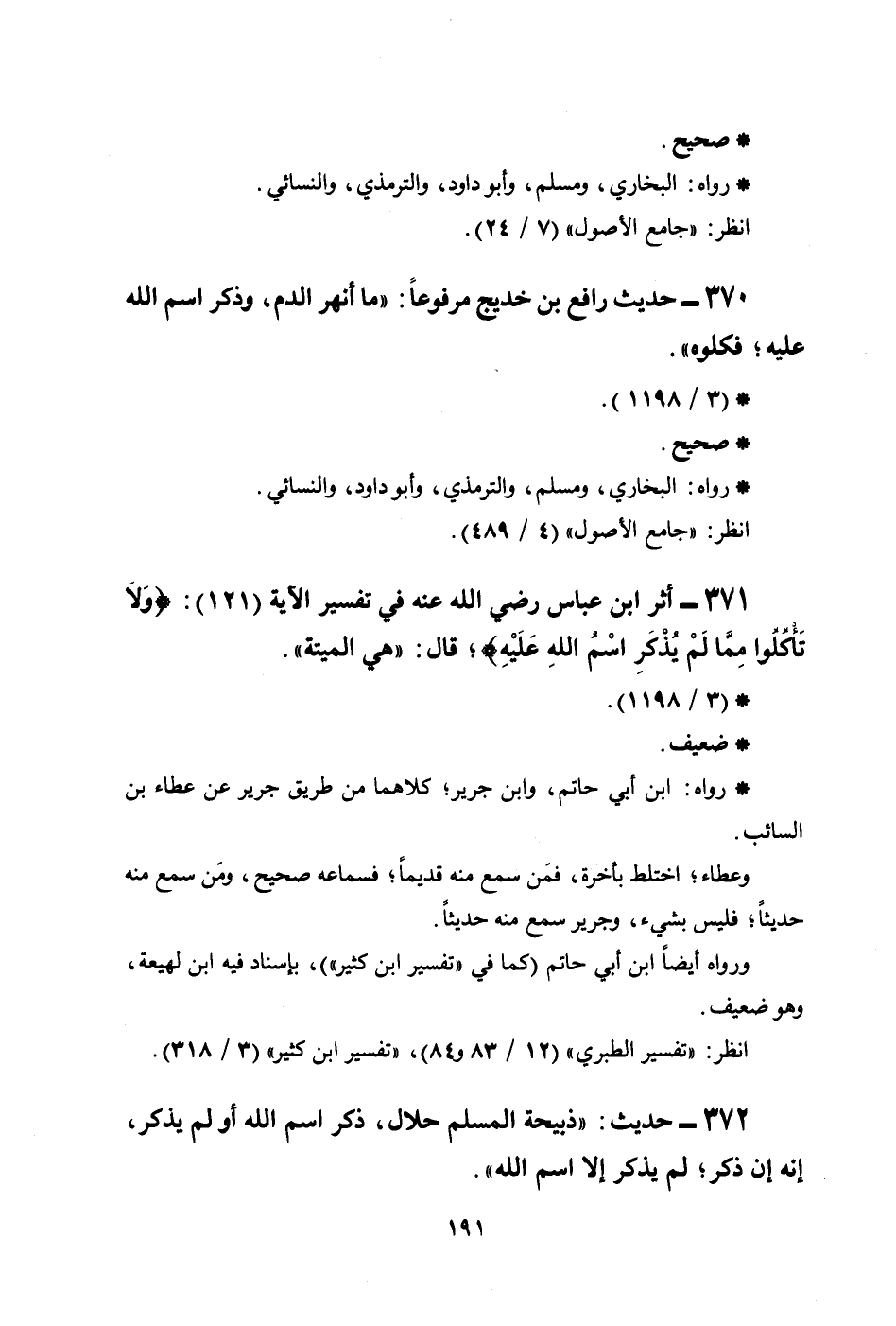 370 - حديث رافع بن خديج مرفوعاً: ((ما أنهر الدم، وذكر اسم الله عليه؛ فكلوه)) .