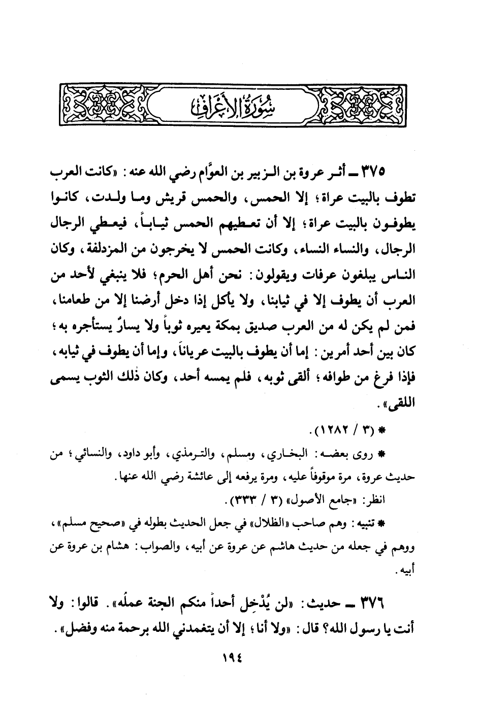 375 - أثر عروة بن الزبير بن العوَّام رضي الله عنه: ((كانت العرب تطوف بالبيت عراة؛ إلا الحمس، والحمس قريش وما ولدت، كانوا يطوفون بالبيت عراة؛ إلا أن تعطيهم الحمس ثياباً، فيعطي الرجال الرجال، والنساء النساء، وكانت الحمس لا يخرجون من المزدلفة، وكان الناس يبلغون عرفات ويقولون: نحن أهل الحرم؛ فلا ينبغي لأحد من العرب أن يطوف إلا في ثيابنا، ولا يأكل إذا دخل أرضنا إلا من طعامنا، فمن لم يكن له من العرب صديق بمكة يعيره ثوباً ولا يسارٌ يستأجره به؛ كان بين أحد أمرين: إما أن يطوف بالبيت عرياناً، وإما أن يطوف في ثيابه، فإذا فرغ من طوافه؛ ألقى ثوبه، فلم يمسه أحد، وكان ذلك الثوب يسمى اللقى)) .