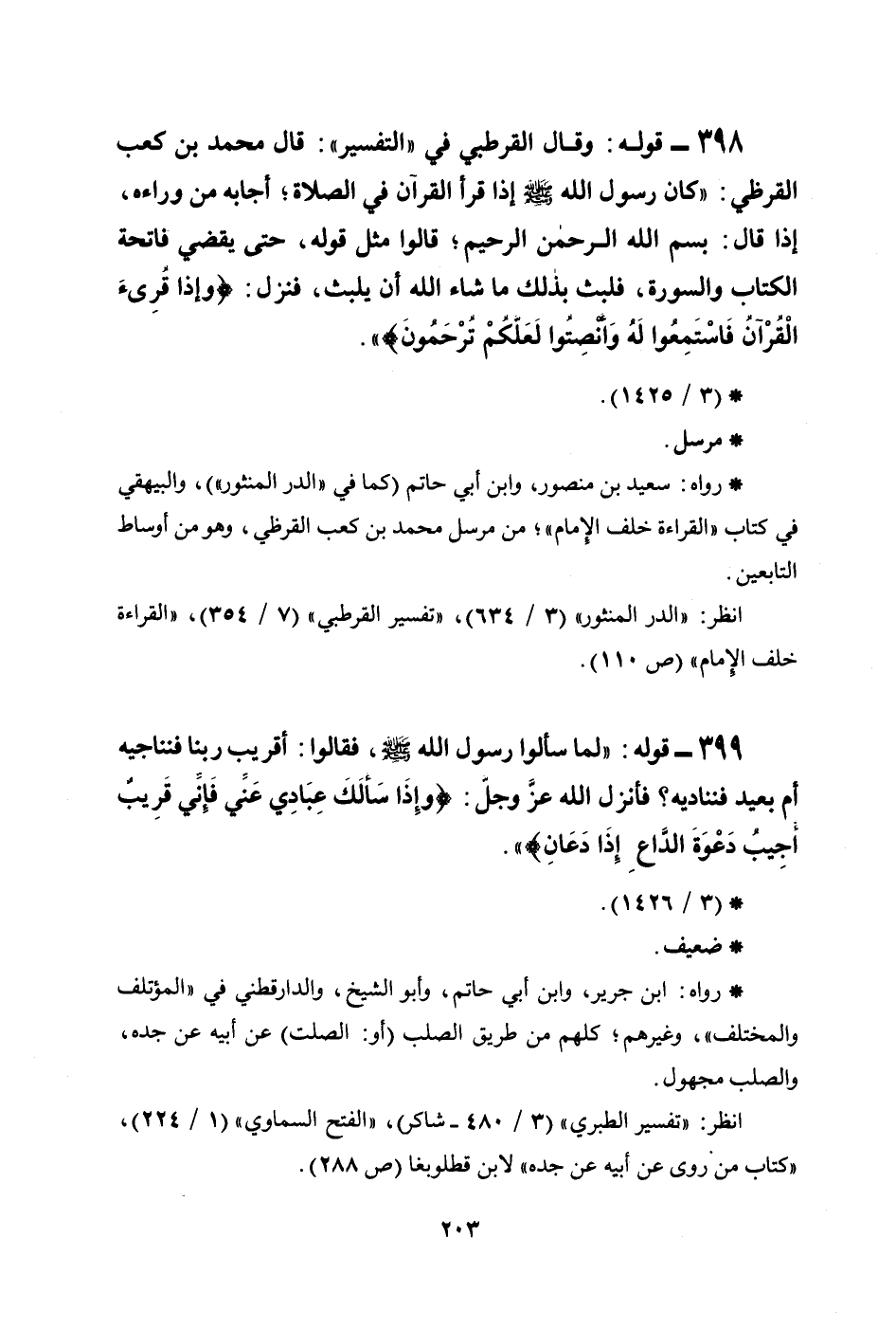 398 - قوله: وقال القرطبي في ((التفسير)) : قال محمد بن كعب القرظي: ((كان رسول الله صلى الله عليه وسلم إذا قرأ القرآن في الصلاة؛ أجابه مَن وراءه، إذا قال: بسم الله الرحمن الرحيم؛ قالوا مثل قوله، حتى يقضي فاتحة الكتاب والسورة، فلبث بذلك ما شاء الله أن يلبث، فنزل: {وَإِذَا قُرِئَ الْقُرْآنُ فَاسْتَمِعُوا لَهُ وَأَنصِتُوا لَعَلَّكُمْ تُرْحَمُونَ} )) .