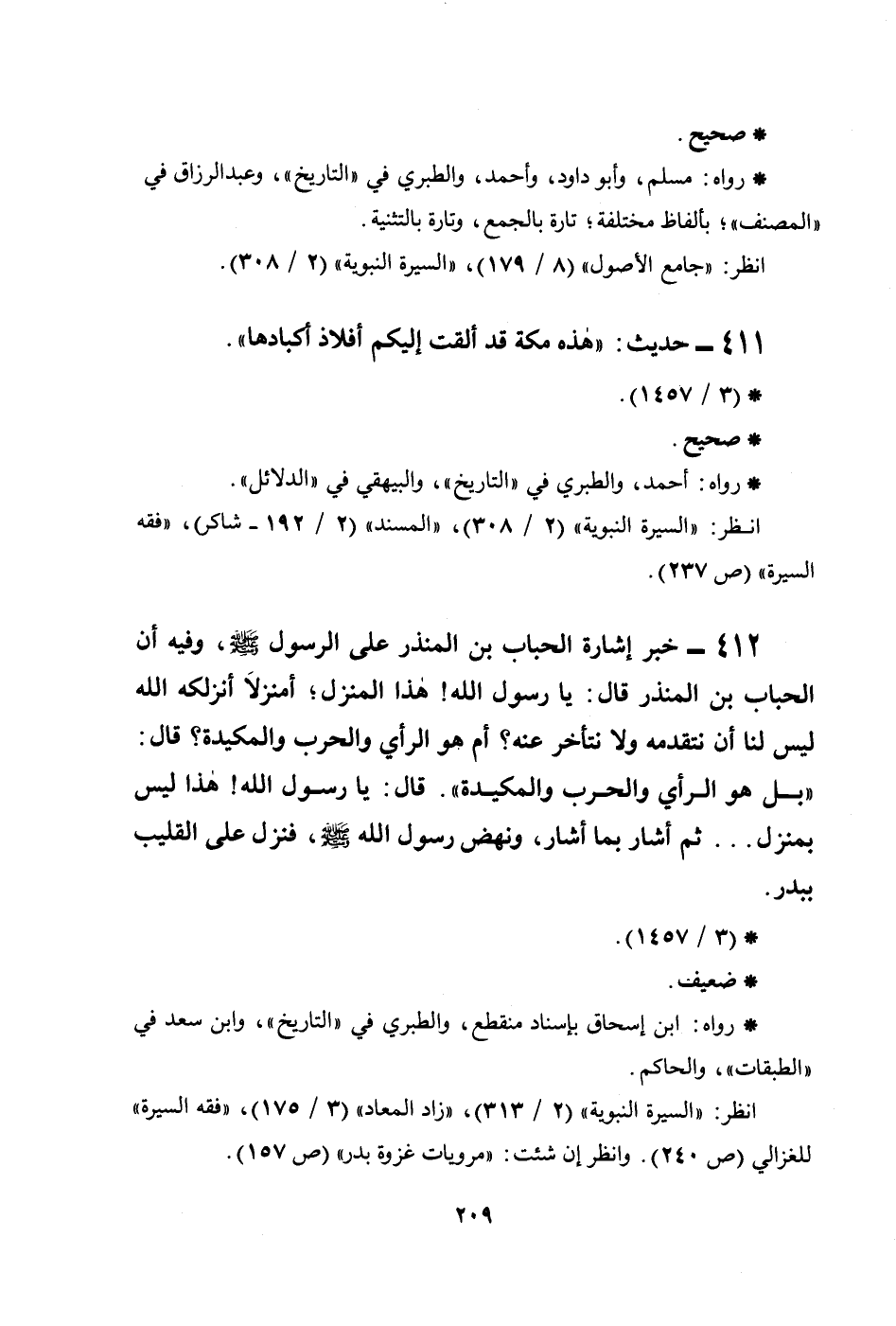 412 - خبر إشارة الحباب بن المنذر على الرسول صلى الله عليه وسلم، وفيه أن الحباب بن المنذر قال: يا رسول الله! هذا المنزل؛ أمنزلاً أنزلكه الله ليس لنا أن نتقدمه ولا نتأخر عنه؟ أم هو الرأي والحرب والمكيدة؟ قال: ((بل هو الرأي والحرب والمكيدة)) . قال: يا رسول الله! هذا ليس بمنزل ... ثم أشار بما أشار، ونهض رسول الله صلى الله عليه وسلم، فنزل على القليب ببدر.