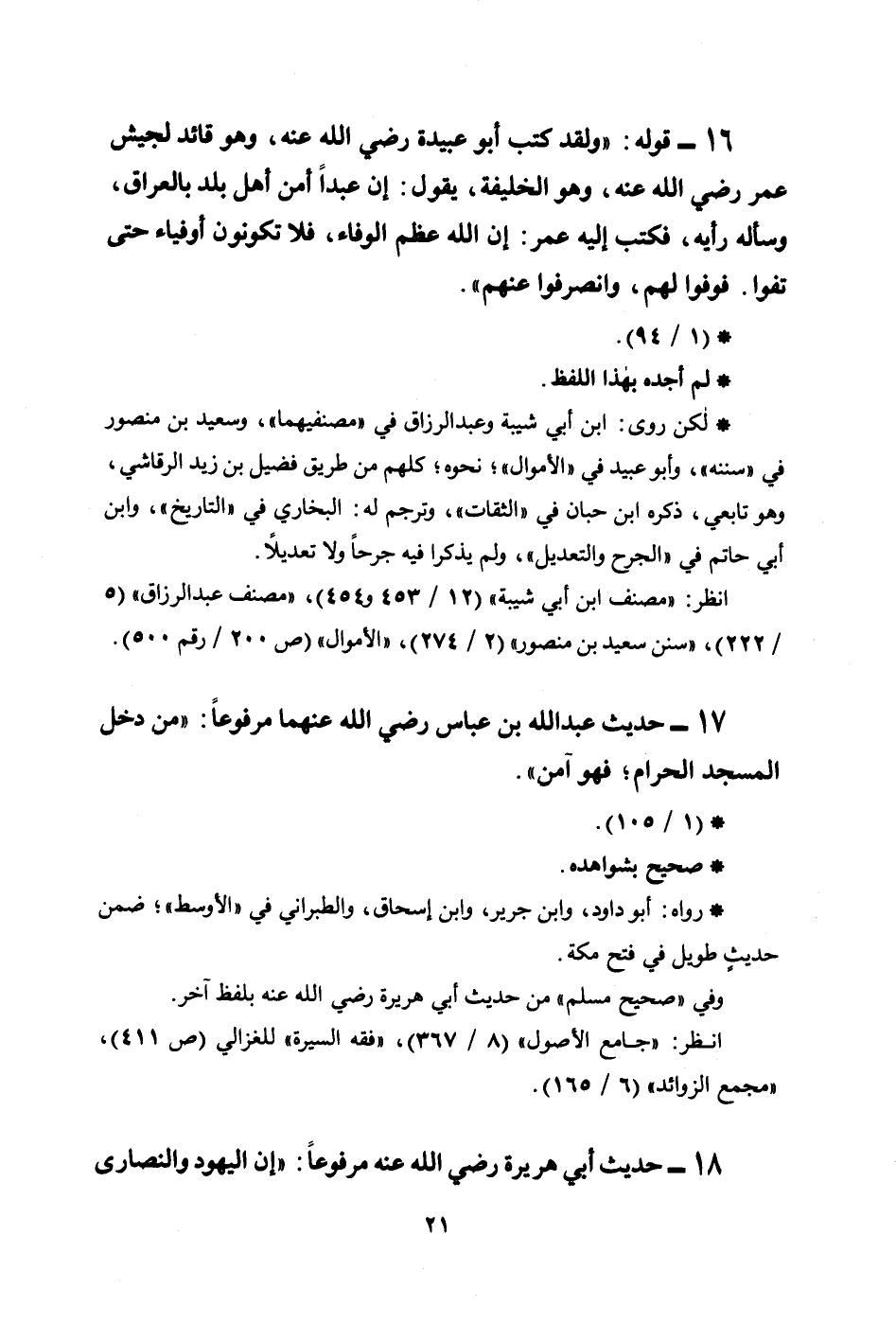 16 - قوله: ((ولقد كتب أبو عبيدة رضي الله عنه، وهو قائد لجيش عمر رضي الله عنه، وهو الخليفة، يقول: إن عبداً أمن أهل بلدٍ بالعراق، وسأله رأيه، فكتب إليه عمر: إن الله عظم الوفاء، فلا تكونون أوفياء حتى تفوا. فوفوا لهم، وانصرفوا عنهم)) .