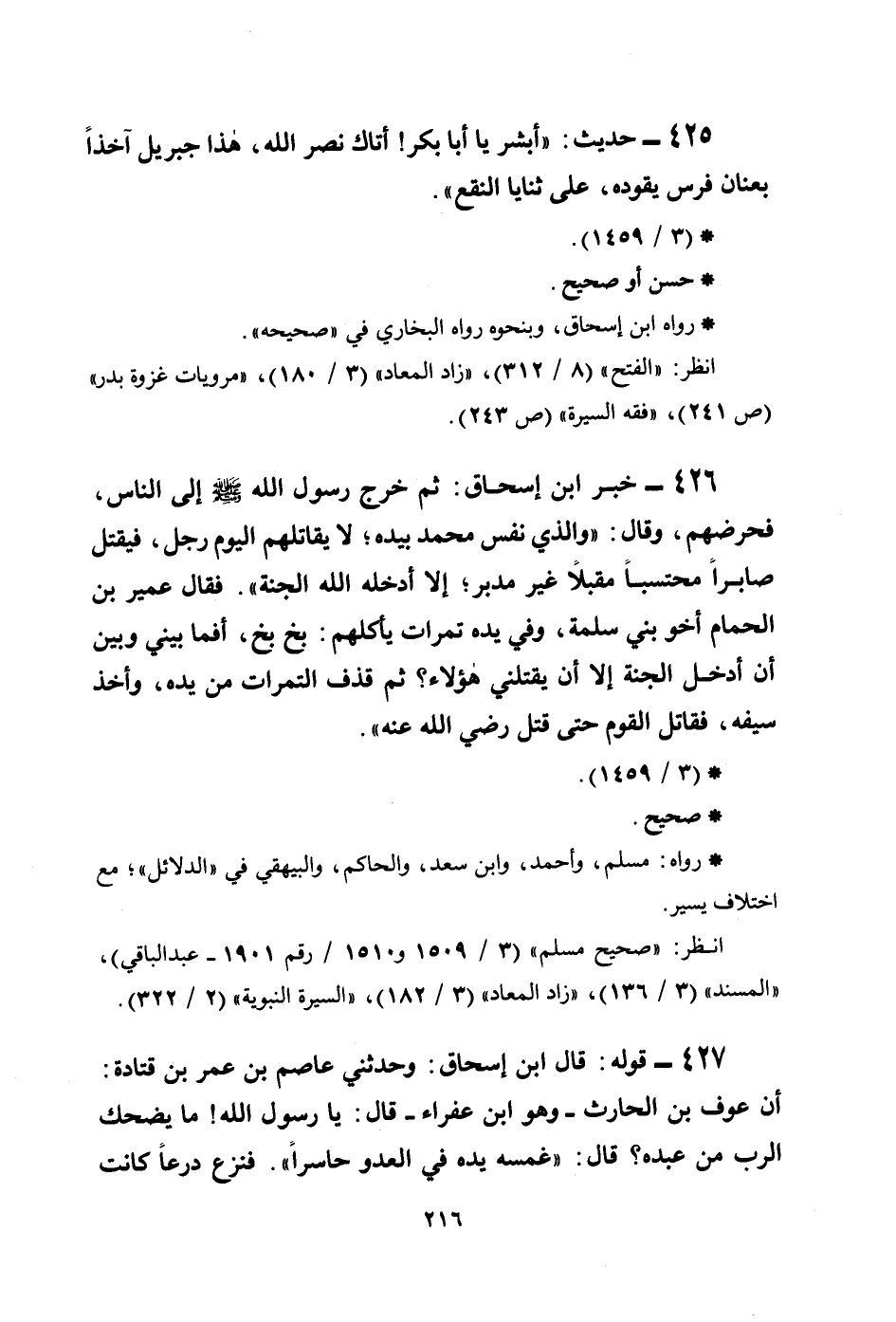 426 - خبر ابن إسحاق: ثم خرج رسول الله صلى الله عليه وسلم إلى الناس، فحرضهم، وقال: ((والذي نفس محمد بيده؛ لا يقاتلهم اليوم رجل، فيقتل صابراً، محتسباً، مقبلاً غير مدبر؛ إلا أدخله الله الجنة)) . فقال عمير بن الحمام أخو بني سلمة، وفي يده تمرات يأكلهم: بخ بخ، أفما بيني وبين أن أدخل الجنة إلا أن يقتلني هؤلاء؟ ثم قذف التمرات من يده، وأخذ سيفه، فقاتل القوم حتى قتل رضي الله عنه)) .