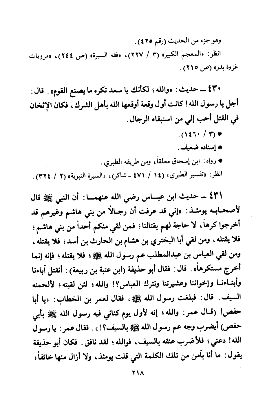 431 - حديث ابن عباس رضي الله عنهما: أن النبي صلى الله عليه وسلم قال لأصحابه يومئذ: ((إني قد عرفت أن رجالاً من بني هاشم وغيرهم قد أخرجوا كرهاً، لا حاجة لهم بقتالنا؛ فمن لقي منكم أحداً من بني هاشم؛ فلا يقتله، ومن لقي أبا البختري بن هشام بن الحارث بن أسد؛ فلا يقتله، ومن لقي العباس بن عبد المطلب عم رسول الله صلى الله عليه وسلم؛ فلا يقتله؛ فإنه إنما أخرج مستكرهاً)) . قال: فقال أبو حذيفة (ابن عتبة بن ربيعة) : أنقتل آباءنا وأبناءنا وإخواننا وعشيرتنا ونترك العباس؟! والله؛ لئن لقيته؛ لألحمنه السيف. قال: فبلغت رسول الله صلى الله عليه وسلم، فقال لعمر بن الخطاب: ((يا أبا حفص! (قال عمر: والله؛ إنه لأول يوم كناني فيه رسول الله صلى الله عليه وسلم بأبي حفص) أيضرب وجه عم رسول الله صلى الله عليه وسلم بالسيف؟!)) . فقال عمر: يا رسول الله! دعني؛ فلأضرب عنقه بالسيف، فوالله؛ لقد نافق. فكان أبو حذيفة يقول: ما أنا بآمن من تلك الكلمة التي قلت يومئذ، ولا أزال منها خائفاً؛