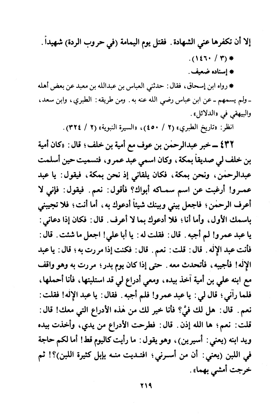 432 - خبر عبد الرحمن بن عوف مع أمية بن خلف؛ قال: ((كان أمية بن خلف لي صديقاً بمكة، وكان اسمي عبد عمرو، فتسميت حين أسلمت عبد الرحمن، ونحن بمكة، فكان يلقاني إذ نحن بمكة، فيقول: يا عبد عمرو! أرغبت عن اسم سماكه أبواك؟ فأقول: نعم. فيقول: فإني لاأعرف الرحمن؛ فاجعل بيني وبينك شيئاً أدعوك به، أما أنت؛ فلا تجيبني باسمك الأول، وأما أنا؛ فلا أدعوك بما لا أعرف. قال: فكان إذا دعاني: يا عبد عمرو! لم أجبه. قال: فقلت له: يا أبا علي! اجعل ما شئت. قال: فأنت عبد الإله. قال: قلت: نعم. قال: فكنت إذا مررت به؛ قال: يا عبد الإله! فأجيبه، فأتحدث معه. حتى إذا كان يوم بدر؛ مررت به وهو واقف مع ابنه علي بن أمية آخذ بيده، ومعي أدراع لي قد استلبتها، فأنا أحملها، فلما رآني؛ قال لي: يا عبد عمرو! فلم أجبه. فقال: يا عبد الإله! فقلت: نعم. قال: هل لك فيَّ؟ فأنا خير لك من هذه الأدراع التي معك! قال: قلت: نعم؛ ها الله إذن. قال: فطرحت الأدراع من يدي، وأخذت بيده ويد ابنه (يعني: أسيرين) ، وهو يقول: ما رأيت كاليوم قط! أما لكم حاجة في اللبن (يعني: أن من أسرني؛ افتديت منه بإبل كثيرة اللبن) ؟! ثم خرجت أمشي بهما)) .