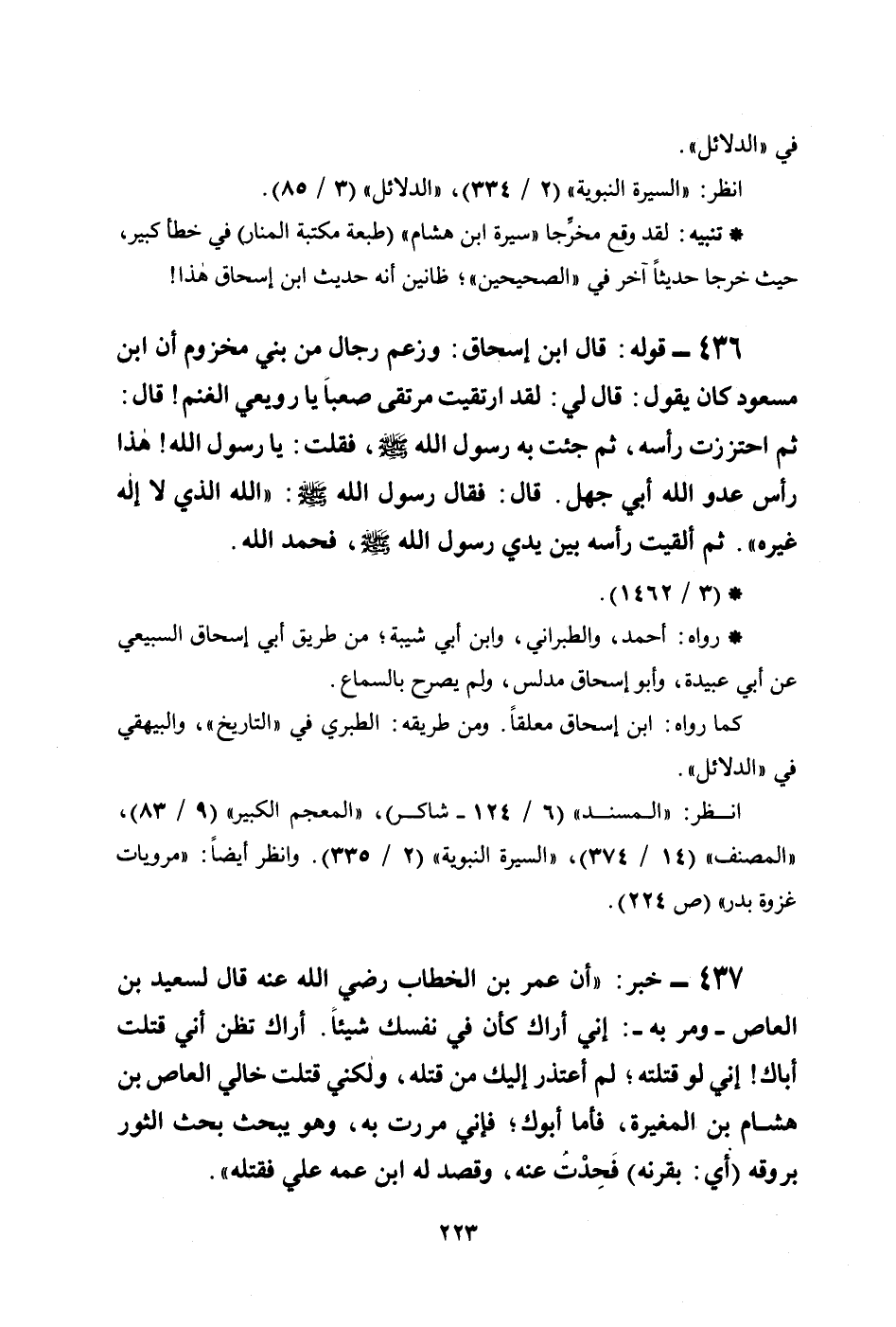 436 - قوله: قال ابن إسحاق: وزعم رجال من بني مخزوم أن ابن مسعود كان يقول: قال لي: لقد ارتقيت مرتقى صعباً يا رويعي الغنم! قال: ثم احتززت رأسه، ثم جئت به رسول الله صلى الله عليه وسلم، فقلت: يا رسول الله! هذا رأس عدو الله أبي جهل. قال: فقال رسول الله صلى الله عليه وسلم: ((الله الذي لا إله غيره)) . ثم ألقيت رأسه بين يدي رسول الله صلى الله عليه وسلم، فحمد الله.