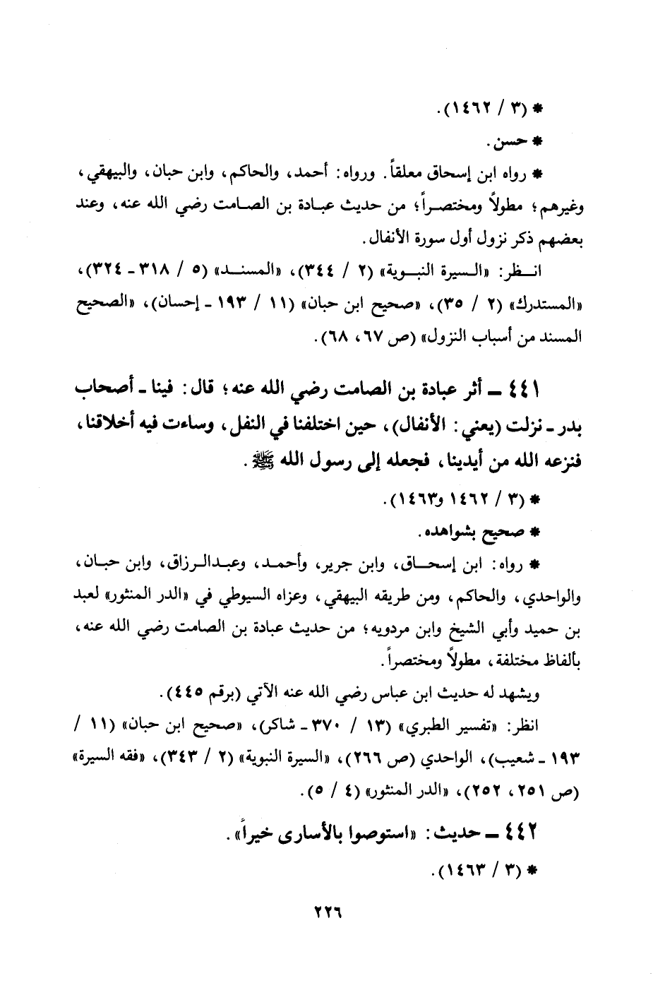 - رواه ابن إسحاق معلقاً. ورواه: أحمد، والحاكم، وابن حبان، والبيهقي، وغيرهم؛ مطولاً ومختصراً؛ من حديث عبادة بن الصامت رضي الله عنه، وعند بعضهم ذكر نزول أول سورة الأنفال.