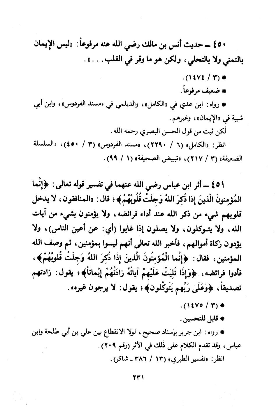 451 - أثر ابن عباس رضي الله عنهما في تفسير قوله تعالى: {إِنَّمَا الْمُؤْمِنُونَ الَّذِين إِذَا ذُكِرَ اللهُ وَجِلَتْ قُلُوبُهُمْ} ؛ قال: ((المنافقون، لا يدخل قلوبهم شيء من ذكر الله عند أداء فرائضه، ولا يؤمنون بشيء من آيات الله، ولا يتوكلون، ولا يصلون إذا غابوا (أي: عن أعين الناس) ، ولا يؤدون زكاة أموالهم، فأخبر الله تعالى أنهم ليسوا بمؤمنين، ثم وصف الله المؤمنين، فقال: {إِنَّمَا الْمُؤْمِنُونَ الَّذِينَ إِذَا ذُكِرَ اللهُ وَجِلَتْ قُلُوبُهُمْ} ، فأدوا فرائضه، {وَإِذَا تُلِيَتْ عَلَيْهِمْ آيَاتُهُ زَادَتْهُمْ إِيمَاناً} ؛ يقول: زادتهم تصديقاً، {وَعَلَى رَبِّهِمْ يَتَوَكَّلُونَ} ؛ يقول: لا يرجون غيره)) .