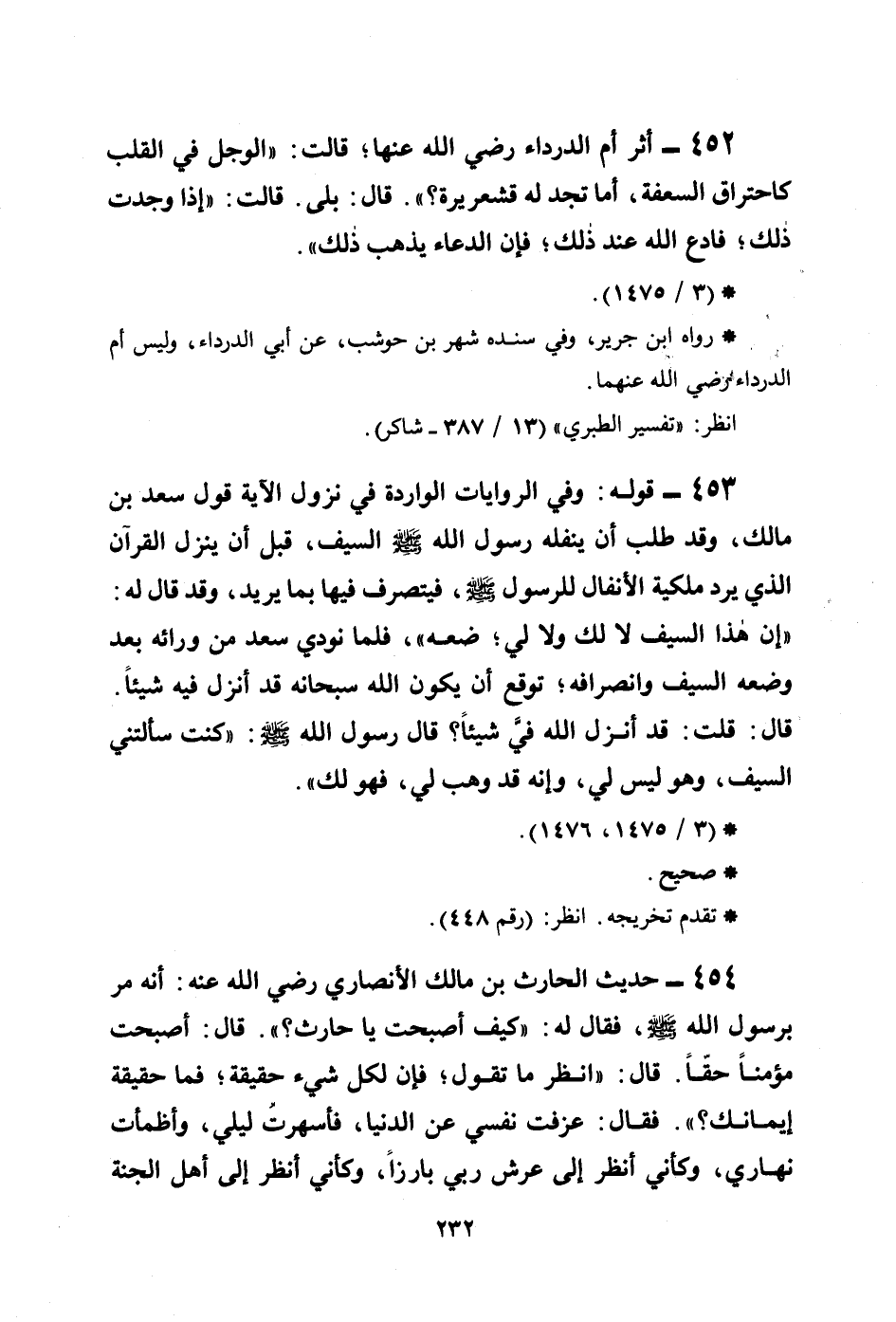 454 - حديث الحارث بن مالك الأنصاري رضي الله عنه: أنه مر برسول الله صلى الله عليه وسلم، فقال له: ((كيف أصبحت يا حارث؟)) . قال: أصبحت مؤمناً حقَّاً. قال: ((انظر ما تقول؛ فإن لكل شيء حقيقة؛ فما حقيقة إيمانك؟)) . فقال: عزفت نفسي عن الدنيا، فأسهرتُ ليلي، وأظمأت نهاري، وكأني أنظر إلى عرش ربي بارزاً، وكأني أنظر إلى أهل الجنة