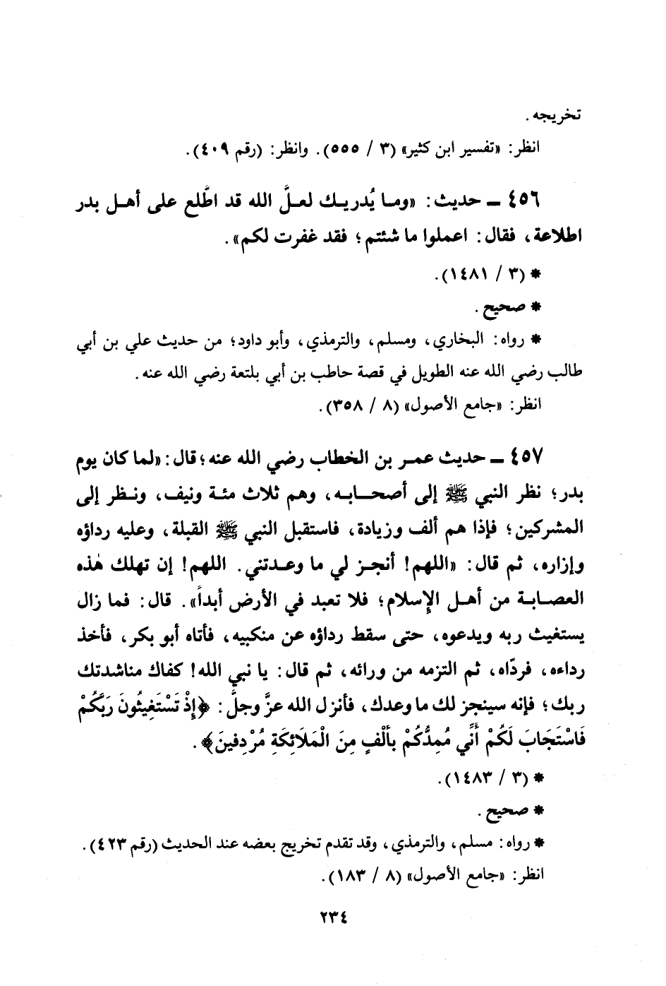 457 - حديث عمر بن الخطاب رضي الله عنه؛ قال: ((لما كان يوم بدر؛ نظر النبي صلى الله عليه وسلم إلى أصحابه، وهم ثلاث مئة ونيف، ونظر إلى المشركين؛ فإذا هم ألف وزيادة، فاستقبل النبي صلى الله عليه وسلم القبلة، وعليه رداؤه وإزاره، ثم قال: ((اللهم! أنجز لي ما وعدتني. اللهم! إن تهلك هذه العصابة من أهل الإسلام؛ فلا تعبد في الأرض أبداً)) . قال: فما زال يستغيث ربه ويدعوه، حتى سقط رداؤه عن منكبيه، فأتاه أبو بكر، فأخذ رداءه، فردَّاه، ثم التزمه من ورائه، ثم قال: يا نبي الله! كفاك مناشدتك ربك؛ فإنه سينجز لك ما وعدك، فأنزل الله عزَّ وجلَّ: {إِذْ تَسْتَغِيثُونَ رَبَّكُمْ فَاسْتَجَابَ لَكُمْ أَنِّي مُمِدُّكُم بِأَلْفٍ مِّنَ الْمَلاَئِكَةِ مُرْدِفِينَ} )) .