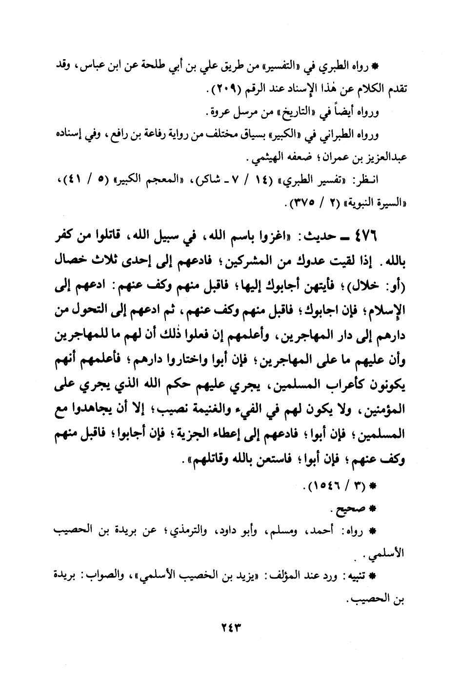 476 - حديث: ((اغزوا باسم الله، في سبيل الله، قاتلوا من كفر بالله. إذا لقيت عدوك من المشركين؛ فادعهم إلى إحدى ثلاث خصال (أو: خلال) ؛ فأيتهن أجابوك إليها؛ فاقبل منهم وكف عنهم: ادعهم إلى الإسلام؛ فإن أجابوك؛ فاقبل منهم وكف عنهم، ثم ادعهم إلى التحول من دارهم إلى دار المهاجرين، وأعلمهم إن فعلوا ذلك أن لهم ما للمهاجرين، وأن عليهم ما على المهاجرين؛ فإن أبوا واختاروا دارهم؛ فأعلمهم أنهم يكونون كأعراب المسلمين، يجري عليهم حكم الله الذي يجري على المؤمنين، ولا يكون لهم في الفيء والغنيمة نصيب؛ إلا أن يجاهدوا مع المسلمين؛ فإن أبوا؛ فادعهم إلى إعطاء الجزية؛ فإن أجابوا؛ فاقبل منهم وكف عنهم؛ فإن أبوا؛ فاستعن بالله وقاتلهم)) .