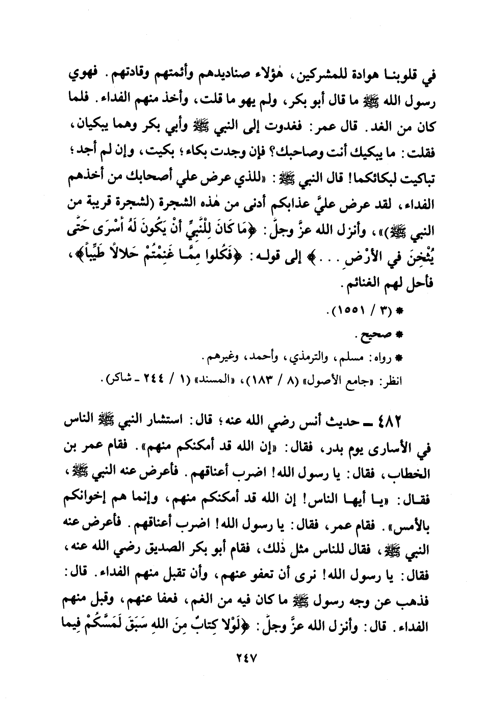 482 - حديث أنس رضي الله عنه؛ قال: استشار النبي صلى الله عليه وسلم الناس في الأسارى يوم بدر، فقال: ((إن الله قد أمكنكم منهم)) . فقام عمر بن الخطاب، فقال: يا رسول الله! اضرب أعناقهم. فأعرض عنه النبي صلى الله عليه وسلم، فقال: ((يا أيها الناس! إن الله قد أمكنكم منهم، وإنما هم إخوانكم بالأمس)) . فقام عمر، فقال: يا رسول الله! اضرب أعناقهم. فأعرض عنه النبي صلى الله عليه وسلم، فقال للناس مثل ذلك، فقام أبو بكر الصديق رضي الله عنه، فقال: يا رسول الله! نرى أن تعفو عنهم، وأن تقبل منهم الفداء. قال: فذهب عن وجه رسول الله صلى الله عليه وسلم ما كان فيه من الغم، فعفا عنهم، وقبل منهم الفداء، قال: وأنزل الله عزَّ وجلَّ: {لَوْلاَ كِتَابٌ مِّنَ اللهِ سَبَقَ لَمَسَّكُمْ فِيمَا