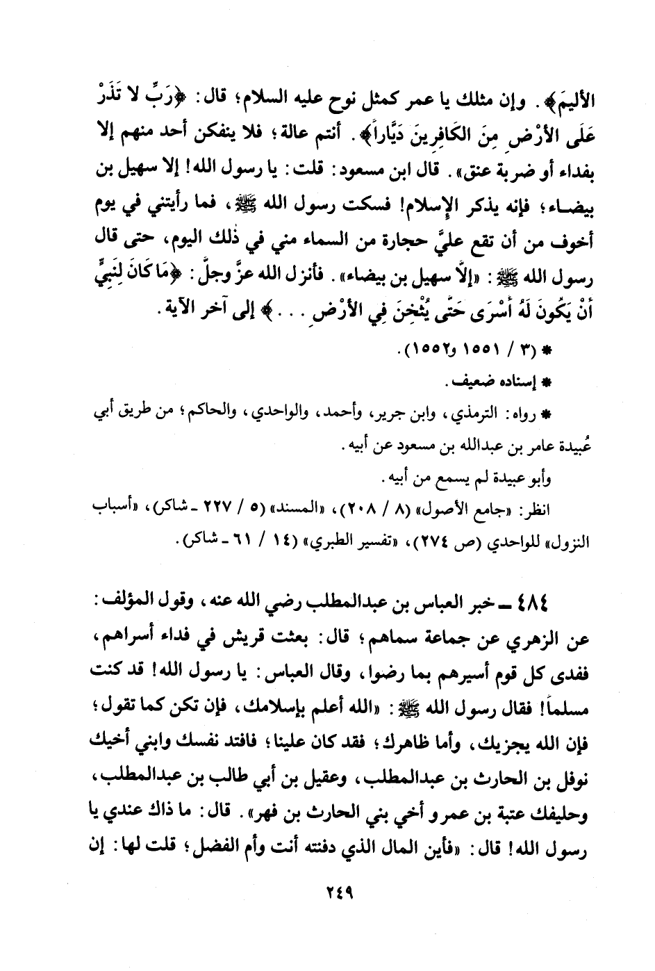 الأَلِيمَ} . وإن مثلك يا عمر كمثل نوح عليه السلام؛ قال: {رَبِّ لاَ تَذَرْ عَلَى الأَرْضِ مِنَ الْكَافِرِينَ دَيَّاراً} . أَنتم عالة؛ فلا ينفكن أحد منهم إلا بفداء أو ضربة عنق)) . قال ابن مسعود: قلت: يا رسول الله! إلا سهيل بن بيضاء؛ فإنه يذكر الإسلام! فسكت رسول الله صلى الله عليه وسلم، فما رأيتني في يوم أخوف من أن تقع عليَّ حجارة من السماء مني في ذلك اليوم، حتى قال رسول الله صلى الله عليه وسلم: ((إلا سهيل بن بيضاء)) .