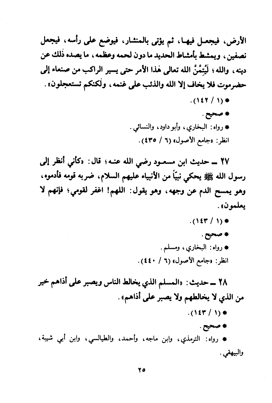 27 - حديث ابن مسعود رضي الله عنه؛ قال: ((كأني أنظر إلى رسول الله صلى الله عليه وسلم يحكي نبيَّاً من الأنبياء عليهم السلام، ضربه قومه فأدموه، وهو يمسح الدم عن وجهه، وهو يقول: اللهم! اغفر لقومي؛ فإنهم لا يعلمون)) .