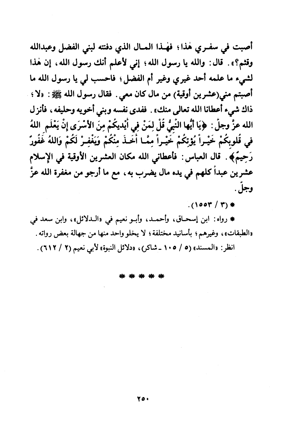 أصبت في سفري هذا؛ فهذا المال الذي دفنته لبني الفضل وعبد الله وقثم؟)) . قال: والله يا رسول الله؛ إني لأعلم أنك رسول الله، إن هذا لشيء ما علمه أحد غيري وغير أم الفضل؛ فاحسب لي يا رسول الله ما أصبتم مني (عشرين أوقية) من مال كان معي. فقال رسول الله صلى الله عليه وسلم: ((لا؛ ذاك شيء أعطانا الله تعالى منك)) . ففدى نفسه وبني أخويه وحليفه، فأنزل الله عزَّ وجلَّ: {يَا أيُّهَا النَّبِي قُل لِّمَن فِي أَيْدِيكُم مِّنَ الأَسْرَى إِن يَّعْلَمِ اللهُ فِي قُلُوبِكُمْ خَيْراً يُّؤْتِكُمْ خَيْراً مِّمَّا أُخِذَ مَنكُمْ وَيَغْفِرْ لَكُمْ وَاللهُ غَفُورٌ رَّحِيمٌ} . قال العباس: فأعطاني الله مكان العشرين الأوقية في الإسلام عشرين عبداً كلهم في يده مال يضرب به، مع ما أرجو من مغفرة الله عزَّ وجلَّ.