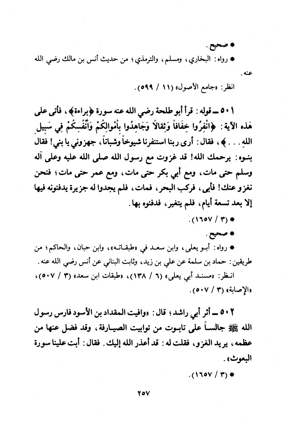 501 - قوله: قرأ أبو طلحة رضي الله عنه سورة {براءة} ، فأتى على هذه الآية: {اِنفِرُوا خِفَافاً وَّثِقَالاً وَّجَاهِدُوا بِأَمْوَالِكُمْ وَأَنفُسِكُمْ فِي سَبِيلِ الله} ، فقال: أرى ربنا استنفرنا شيوخاً وشباناً، جهزوني يا بني! فقال بنوه: يرحمك الله! قد غزوت مع رسول الله صلى الله عليه وعلى آله وسلم حتى مات، ومع أبي بكر حتى مات، ومع عمر حتى مات؛ فنحن نغزو عنك! فأبى، فركب البحر، فمات، فلم يجدوا له جزيرة يدفنونه فيها إلا بعد تسعة أيام، فلم يتغير، فدفنوه بها.