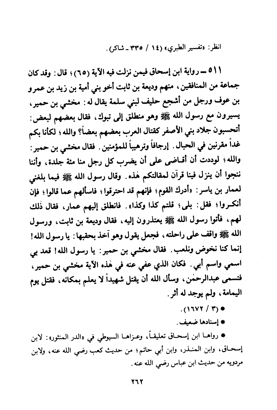 511 - رواية ابن إسحاق فيمن نزلت فيه الآية (65) ؛ قال: وقد كان جماعة من المنافقين، منهم وديعة بن ثابت أخو بني أمية بن زيد ابن عمرو بن عوف ورجل من أشجع حليف لبني سلمة يقال له: مخشي بن حمير، يسيرون مع رسول الله صلى الله عليه وسلم وهو منطلق إلى تبوك، فقال بعضهم لبعض: أتحسبون جلاد بني الأصفر كقتال العرب بعضهم بعضاً؟ والله؛ لكأنا بكم غداً مقرنين في الحبال. إرجافاً وترهيباً للمؤمنين. فقال مخشي بن حمير: والله؛ لوددت أن أقاضى على أن يضرب كل رجل منا مئة جلدة، وأننا ننجوا أن ينزل فينا قرآن لمقالتكم هذه. وقال رسول الله صلى الله عليه وسلم فيما بلغني لعمار بن ياسر: ((أدرك القوم؛ فإنهم قد احترقوا؛ فاسألهم عما قالوا؛ فإن أنكروا؛ فقل: بلى؛ قلتم كذا وكذا)) . فانطلق إليهم عمار، فقال ذلك لهم، فأتوا رسول الله صلى الله عليه وسلم يعتذرون إليه، فقال وديعة بن ثابت، ورسول الله صلى الله عليه وسلم واقف على راحلته، فجعل يقول وهو آخذ بحقبها: يا رسول الله! إنما كنا نخوض ونلعب. فقال مخشي بن حمير: يا رسول الله! قعد بي اسمي واسم أبي. فكان الذي عفي عنه في هذه الآية مخشي بن حمير، فتسمى عبد الرحمن، وسأل الله أن يقتل شهيداً لا يعلم بمكانه، فقتل يوم اليمامة، ولم يوجد له أثر.