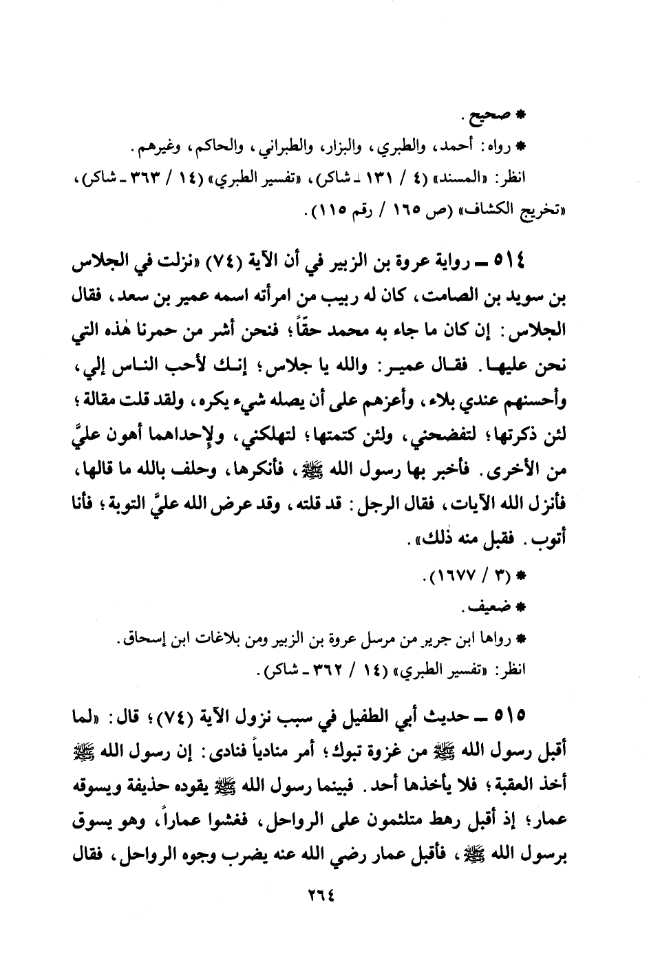 514 - رواية عروة بن الزبير في أن الآية (74) ((نزلت في الجلاس بن سويد بن الصامت، كان له ربيب من امرأته اسمه عمير بن سعد، فقال الجلاس: إن كان ما جاء به محمد حقَّاً؛ فنحن أشر من حمرنا هذه التي نحن عليها. فقال عمير: والله يا جلاس؛ إنك لأحب الناس إلي، وأحسنهم عندي بلاء، وأعزهم على أن يصله شيء يكره، ولقد قلت مقالة؛ لئن ذكرتها لتفضحني، ولئن كتمتها؛ لتهلكني، ولإحداهما أهون عليَّ من الأخرى. فأخبر بها رسول الله صلى الله عليه وسلم، فأنكرها، وحلف بالله ما قالها، فأنزل الله الآيات، فقال الرجل: قد قلته، وقد عرض الله عليَّ التوبة؛ فأنا أتوب. فقبل منه ذلك)) .