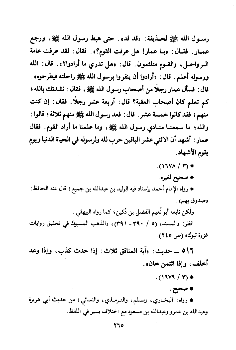 رسول الله صلى الله عليه وسلم لحذيفة: ((قد قد)) . حتى هبط رسول الله صلى الله عليه وسلم، ورجع عمار. فقال: ((يا عمار! هل عرفت القوم؟)) . فقال: لقد عرفت عامة الرواحل، والقوم متلثمون. قال: ((هل تدري ما أرادوا؟)) . قال: الله ورسوله أعلم. قال: ((أرادوا أن ينفروا برسول الله صلى الله عليه وسلم راحلته فيطرحوه)) . قال: فسأل عمار رجلاً من أصحاب رسول الله صلى الله عليه وسلم، فقال: ناشدتك بالله؛ كم تعلم كان أصحاب العقبة؟ قال: أربعة عشر رجلاً. فقال: إن كنت منهم؛ فقد كانوا خمسة عشر. قال: فعد رسول الله صلى الله عليه وسلم منهم ثلاثة؛ قالوا: والله؛ ما سمعنا منادي رسول الله صلى الله عليه وسلم، وما علمنا ما أراد القوم. فقال عمار: أشهد أن الاثني عشر الباقين حرب لله ولرسوله في الحياة الدنيا ويوم يقوم الأشهاد.
