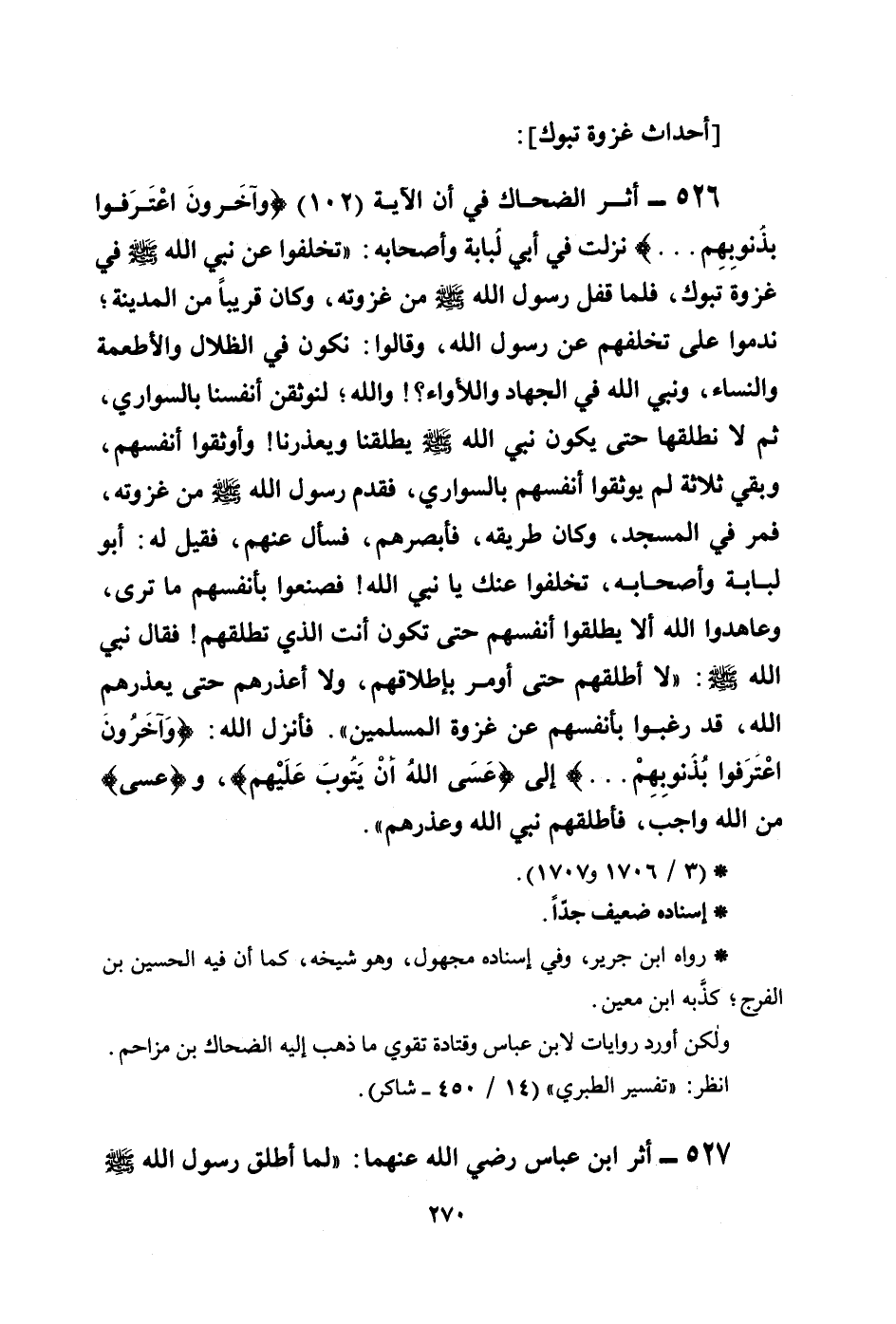 526 - أثر الضحاك في أن الآية (102) {وَآخَرُونَ اعْتَرَفُوا بِذُنُوبِهِمْ ... } نزلت في أبي لُبابة وأصحابه: ((تخلفوا عن نبي الله صلى الله عليه وسلم في غزوة تبوك، فلما قفل رسول الله صلى الله عليه وسلم من غزوته، وكان قريباً من المدينة؛ ندموا على تخلفهم عن رسول الله، وقالوا: نكون في الظلال والأطعمة والنساء، ونبي الله في الجهاد واللأواء؟! والله؛ لنوثقن أنفسنا بالسواري، ثم لا نطلقها حتى يكون نبي الله صلى الله عليه وسلم يطلقنا ويعذرنا! وأوثقوا أنفسهم، وبقي ثلاثة لم يوثقوا أنفسهم بالسواري، فقدم رسول الله صلى الله عليه وسلم من غزوته، فمر في المسجد، وكان طريقه، فأبصرهم، فسأل عنهم، فقيل له: أبو لبابة وأصحابه، تخلفوا عنك يا نبي الله! فصنعوا بأنفسهم ما ترى، وعاهدوا الله ألا يطلقوا أنفسهم حتى تكون أنت الذي تطلقهم! فقال نبي الله صلى الله عليه وسلم: ((لا أطلقهم حتى أومر بإطلاقهم، ولا أعذرهم حتى يعذرهم الله، قد رغبوا بأنفسهم عن غزوة المسلمين)) . فأنزل الله: {وَآخَرُونَ اعْتَرَفُوا بِذُنُوبِهِمْ ... } إلى {عَسَى اللهُ أَن يَّتُوبَ عَلَيْهِمْ} ، و {عَسَى} من الله واجب، فأطلقهم نبي الله وعذرهم)) .