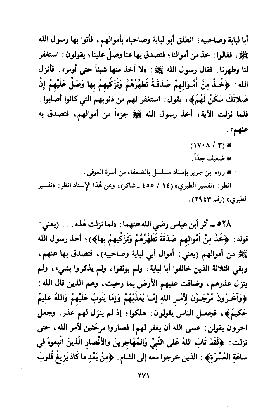 528 - أثر ابن عباس رضي الله عنهما: ((لما نزلت هذه ... (يعني: قوله: {خُذْ مِنْ أَمْوَالِهِمْ صَدَقَةً تُطَهِّرُهُمْ وَتُزَكِّيهِم بِهَا} ) ؛ أخذ رسول الله صلى الله عليه وسلم من أموالهم (يعني: أموال أبي لبابة وصاحبيه) ، فتصدق بها عنهم، وبقي الثلاثة الذين خالفوا أبا لبابة، ولم يوثقوا، ولم يذكروا بشيء، ولم ينزل عذرهم، وضاقت عليهم الأرض بما رحبت، وهم الذين قال الله: {وَآخَرُونَ مُرْجَوْنَ لأَمْرِ اللهِ إِمَّا يُعَذِّبُهُمْ وَإِمَّا يَتُوبُ عَلَيْهِمْ وَاللهُ عَلِيمٌ حَكِيمٌ} ، فجعل الناس يقولون: هلكوا؛ إذ لم ينزل لهم عذر. وجعل آخرون يقولون: عسى الله أن يغفر لهم! فصاروا مرجَئين لأمر الله، حتى نزلت: {لَقد تَّابَ اللهُ عَلَى النَّبِيِّ وَالْمُهَاجِرِينَ وَالأَنصَارِ الَّذِينَ اتَّبَعُوهُ فِي سَاعَةِ الْعُسْرَةِ} : الذين خرجوا معه إلى الشام. {مِن بَعْدِ مَا كَادَ يَزِيغُ قُلُوبُ