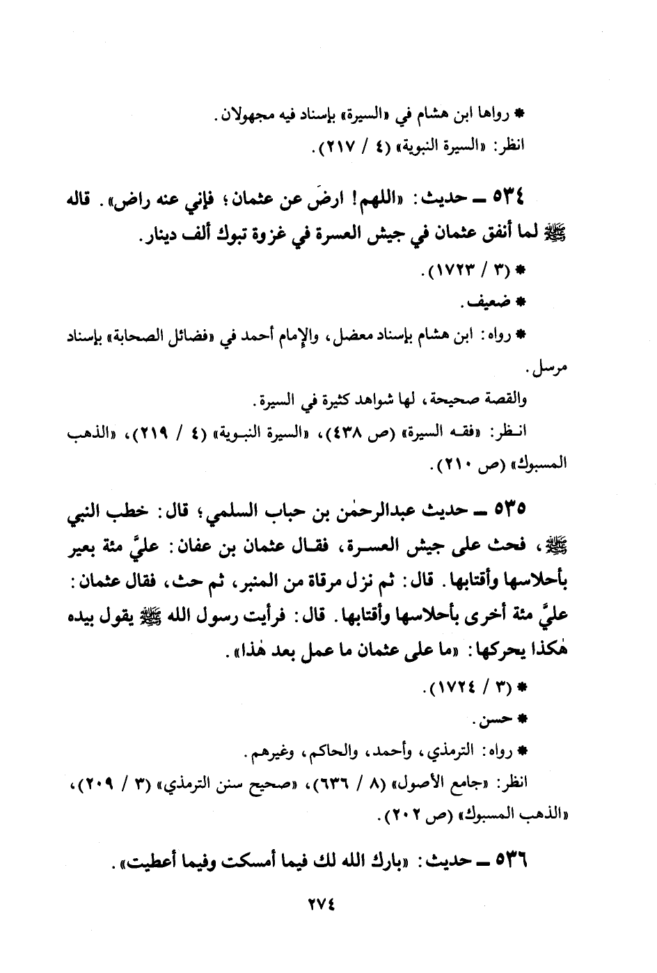 534 - حديث: ((اللهم! ارضَ عن عثمان؛ فإني عنه راض)) . قاله صلى الله عليه وسلم لما أنفق عثمان في جيش العسرة في غزوة تبوك ألف دينار.